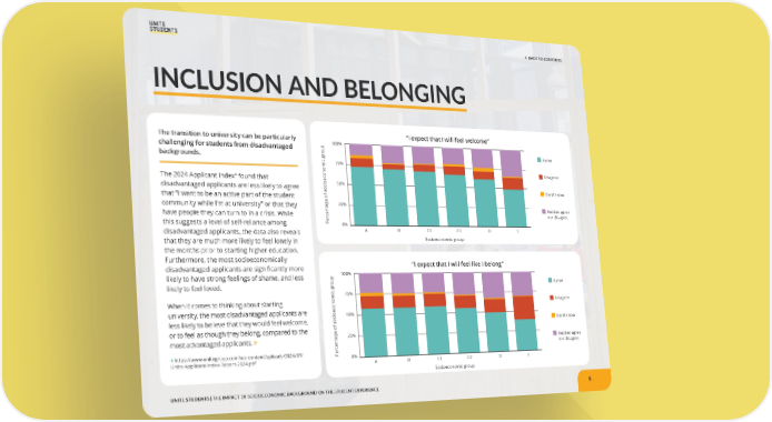 < BACK TO CONTENTS UNITE STUDENTS | THE IMPACT OF SOCIOECONOMIC BACKGROUND ON THE STUDENT EXPERIENCE 6 The transition to university can be particularly challenging for students from disadvantaged backgrounds. The 2024 Applicant Index4 found that disadvantaged applicants are less likely to agree that “I want to be an active part of the student community while I’m at university” or that they have people they can turn to in a crisis. While this suggests a level of self-reliance among disadvantaged applicants, the data also reveals that they are much more likely to feel lonely in the months prior to starting higher education. Furthermore, the most socioeconomically disadvantaged applicants are significantly more likely to have strong feelings of shame, and less likely to feel loved. When it comes to thinking about starting university, the most disadvantaged applicants are less likely to believe that they would feel welcome, or to feel as though they belong, compared to the most advantaged applicants. > 4 https://www.unitegroup.com/wp-content/uploads/2024/07/ Unite-Applicant-Index-Report-2024.pdf INCLUSION AND BELONGING Percentage of socioeconomic group Percentage of socioeconomic group “I expect that I will feel welcome” “I expect that I will feel like I belong” Socioeconomic group Socioeconomic group A A C2 C2 B B D D C1 C1 E E 100% 100% Agree Disagree Don’t know Neither agree nor disagree Agree Disagree Don’t know Neither agree nor disagree 75% 75% 50% 50% 25% 25% 0% 0%