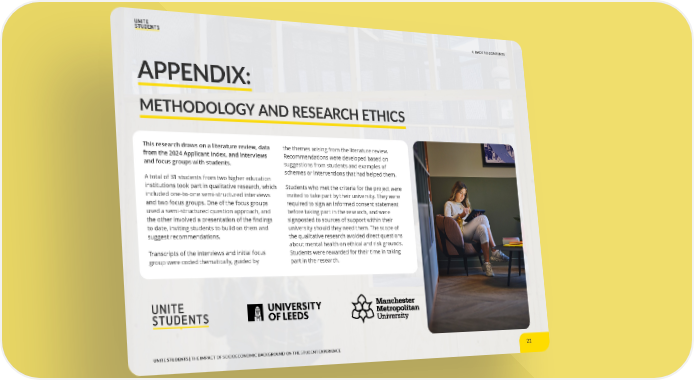 22 < BACK TO CONTENTS UNITE STUDENTS | THE IMPACT OF SOCIOECONOMIC BACKGROUND ON THE STUDENT EXPERIENCE This research draws on a literature review, data from the 2024 Applicant Index, and interviews and focus groups with students. A total of 31 students from two higher education institutions took part in qualitative research, which included one-to-one semi-structured interviews and two focus groups. One of the focus groups used a semi-structured question approach, and the other involved a presentation of the findings to date, inviting students to build on them and suggest recommendations. Transcripts of the interviews and initial focus group were coded thematically, guided by the themes arising from the literature review. Recommendations were developed based on suggestions from students and examples of schemes or interventions that had helped them. Students who met the criteria for the project were invited to take part by their university. They were required to sign an informed consent statement before taking part in the research, and were signposted to sources of support within their university should they need them. The scope of the qualitative research avoided direct questions about mental health on ethical and risk grounds. Students were rewarded for their time in taking part in the research. APPENDIX: METHODOLOGY AND RESEARCH ETHICS