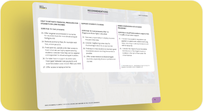 < BACK TO CONTENTS UNITE STUDENTS | THE IMPACT OF SOCIOECONOMIC BACKGROUND ON THE STUDENT EXPERIENCE HELP TO MITIGATE FINANCIAL PRESSURES FOR STUDENTS ON LOW INCOMES EORR Risk 10: Cost pressures 23. Offer targeted accommodation bursaries for students from the most disadvantaged backgrounds 24. Remove additional fees, for example resit fees, where possible 25. Food pantries, parcels and other access to food initiatives are highly appreciated by students; consider how they can be targeted and expanded for disadvantaged students 26. Consider how to support students who have ‘gaps’ between loan payments and accommodation costs in both PBSA and HMO 27. Offer access to laptop schemes SUPPORT STUDENTS TO WORK EORR Risk 10: Cost pressures; Risk 12: Progression from higher education 28. Take every opportunity to employ students into part-time roles 29. Consider ringfencing some roles for disadvantaged students as appropriate 30. Find ways to help students to maintain good boundaries around working time as far as possible 31. Offer career mentors to disadvantaged students, especially those on professional courses EMBED COMPASSION INTO STUDENT PROCESSES11 EORR Risk 6: Insufficient academic support; Risk 7: Insufficient personal support 32. Consider how academic regulations are applied to students who need to work long hours, including no-penalty extensions and online resources 33. Consider the impact of accommodation maintenance or flat-dispute issues on students in the light of their wider life circumstances 12 https://www.ntu.ac.uk/__data/assets/pdf_file/0030/2526771/ Compassionate-Communication-Statement.pdf RECOMMENDATIONS 18