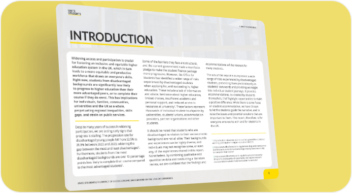 3 < BACK TO CONTENTS UNITE STUDENTS | THE IMPACT OF SOCIOECONOMIC BACKGROUND ON THE STUDENT EXPERIENCE Widening access and participation is crucial for fostering an inclusive and equitable higher education system in the UK, which in turn leads to a more equitable and productive workforce that draws on everyone’s skills. Right now, students from disadvantaged backgrounds are significantly less likely to progress to higher education than their more advantaged peers, or to complete their course if they do enrol. This has implications for individuals, families, communities, universities and the UK as a whole, perpetuating regional inequalities, skills gaps, and strain on public services. Despite many years of success in widening participation, we are seeing early signs that progress is stalling. The progression rate for disadvantaged young people fell from 32.5% to 31.9% between 2022 and 2023, widening the gap between the most and least disadvantaged1. Furthermore, students from the most disadvantaged backgrounds are over 10 percentage points less likely to complete their course compared to the most advantaged students2. Some of the barriers they face are structural, and the current government made a manifesto pledge to make the student finance package more progressive. However, the Office for Students has identified a wider range of risks experienced by disadvantaged students when applying for, and succeeding in, higher education. These include a lack of information and advice, hesitance about higher education, limited choices, insufficient academic and personal support, and reduced access to resources at university3. These factors represent thousands of individual student touchpoints by universities, students’ unions, accommodation providers, partner organisations and other students. It should be noted that students who are disadvantaged in relation to their socioeconomic background are not all alike. Their backgrounds and experiences can be highly diverse, and individuals may not recognise some, or even any, of the experiences shared in this report. Nonetheless, by combining qualitative and quantitative data and conducting a literature review, we are confident that the findings and recommendations will be relevant for many students. The aim of this report is to represent a wide range of risks experienced by disadvantaged students, presenting them predominantly in students’ own words and providing an insight into individual student journeys. It provides recommendations, co-created by students themselves, that highlight opportunities to make a positive difference. While there is some focus on student accommodation, we have chosen to let the students guide the narrative, and to raise the issues and potential solutions that are important to them. This report, therefore, is for everyone who works with and for students in the UK. 1 https://explore-education-statistics.service.gov.uk/find-statistics/ widening-participation-in-higher-education/2022-23 2 https://www.officeforstudents.org.uk/news-blog-and-events/press- and-media/students-from-disadvantaged-backgrounds-less-likely- to-complete-their-course/ 3 https://www.officeforstudents.org.uk/for-providers/equality- of-opportunity/equality-of-opportunity-risk-register/student- characteristics/students-from-low-income-households/ INTRODUCTION
