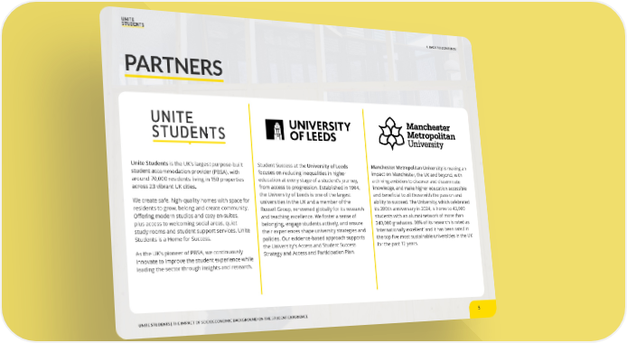 5 < BACK TO CONTENTS UNITE STUDENTS | THE IMPACT OF SOCIOECONOMIC BACKGROUND ON THE STUDENT EXPERIENCE Unite Students is the UK’s largest purpose-built student accommodation provider (PBSA), with around 70,000 residents living in 150 properties across 23 vibrant UK cities. We create safe, high-quality homes with space for residents to grow, belong and create community. Offering modern studios and cosy en-suites, plus access to welcoming social areas, quiet study rooms and student support services, Unite Students is a Home for Success. As the UK’s pioneer of PBSA, we continuously innovate to improve the student experience while leading the sector through insights and research. Student Success at the University of Leeds focuses on reducing inequalities in higher education at every stage of a student’s journey, from access to progression. Established in 1904, the University of Leeds is one of the largest universities in the UK and a member of the Russell Group, renowned globally for its research and teaching excellence. We foster a sense of belonging, engage students actively, and ensure their experiences shape university strategies and policies. Our evidence-based approach supports the University’s Access and Student Success Strategy and Access and Participation Plan. Manchester Metropolitan University is making an impact on Manchester, the UK and beyond, with a driving ambition to discover and disseminate knowledge, and make higher education accessible and beneficial to all those with the passion and ability to succeed. The University, which celebrated its 200th anniversary in 2024, is home to 43,000 students with an alumni network of more than 340,000 graduates. 90% of its research is rated as ‘internationally excellent’ and it has been rated in the top five most sustainable universities in the UK for the past 12 years. PARTNERS