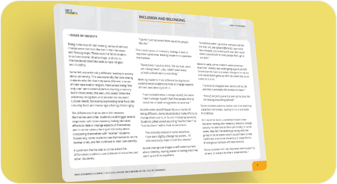 < BACK TO CONTENTS UNITE STUDENTS | THE IMPACT OF SOCIOECONOMIC BACKGROUND ON THE STUDENT EXPERIENCE > ISSUES OF IDENTITY Being conscious of their identity, sense of self and change were common themes in the interviews and focus groups. These could be felt in relation to socioeconomic disadvantage, and also to intersectional identities such as race, religion and disability. Some felt uncomfortably different, leading to anxiety about university. This was especially the case among students who felt that they were different in terms of their race and/or religion. Fears about being “the only one” were common before starting university but in most cases, this was unfounded. When the university recognises and provides for students’ cultural needs, for example providing halal food, this can allay fears and encourage a feeling of belonging. The differences that students felt between themselves and other students could trigger several responses: self-consciousness, feeling alienated, efforts to hide or change aspects of themselves, and in some cases a feeling of inferiority when comparing themselves with “normal” students. Conversely, some students saw themselves to be the normal ones, and felt confident in their own identity. A common theme was surprise about the differences students saw between themselves and other students. “I guess I just assumed there would be people like me.” This could cause, or intensify, feelings linked to imposter syndrome, leading students to question themselves. “Sometimes I used to think, ‘Oh my God, what am I doing here?’. Like, I didn’t even know private schools were a real thing.” Meeting students from different backgrounds could prompt students to hide or change aspects of their own identity to fit in. “I am included when I change myself, but when I don’t change myself I find that people kind of avoid me or walk on eggshells around me.” Accents were raised frequently as a marker of being different. Some students had made efforts to change their accent, or found it changing naturally. Students talked about sounding “too Northern” or “too Southern” within their environment. “I’ve actually noticed in some situations… I can even slightly change my accent… I’ll subconsciously make it a bit less intense.” Accent change can trigger a self-consciousness about identity, leaving students feeling that they don’t quite fit in anywhere. “Sometimes when I go home, everyone will tell me that, oh, you speak differently, your voice has changed, you sound posh now. But I don’t think I sound posh to most people that I go to uni with.” More broadly, some students were conscious that their identity was undergoing a gradual shift. Sometimes this was a planned change to ‘strive for a lot more than I grew up with’, but even this could come at a price. “I’ve kind of struggled with identity all my life and that is probably the hardest it’s been.” “Part of me feels proud but part of me feels like I’m leaving everything behind.” Some students came to realise over time that they could be themselves, leading to more authentic friendships. On the other hand, a some had heard other students making discriminatory remarks, though usually not directed at them personally. In some cases, they felt the need to go along with the group to be accepted which caused them to feel conflicted, and some chose to pull away from a friend group because of these remarks. Some students felt that they were stereotyped by others, or subject to others’ expectations, > INCLUSION AND BELONGING 9