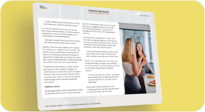 < BACK TO CONTENTS UNITE STUDENTS | THE IMPACT OF SOCIOECONOMIC BACKGROUND ON THE STUDENT EXPERIENCE > “I knew I wanted to go [to university] but I kind of had to take a year out just to work and save up.” For those who needed to work long hours during term time for financial reasons, this could be onerous, causing them to miss out on other experiences or compromise their academic deadlines. “Last week I worked 30 hours and I had to hand in the draft of my dissertation the same week.” However, there were also students who had part time work with, or related to, the university. They tended to have a better balance between work, study and socialising, more flexibility and were happy with the work they were doing. Working for the university also helped them to draw boundaries around their hours and reach a good balance. In addition to part-time work, issues around graduate work were raised. A student on a professional course had heard peers talk about family connections that would lead to a more lucrative career, which reinforced the ongoing disadvantage that the student faced after graduation. FINANCIAL SKILLS Students generally considered themselves to have sound financial skills which in most cases were learned from their family. They took pride in good planning and budgeting, ability to shop around and find amazing bargains, create savings for emergencies and for treats, and making prudent decisions. There was also an appreciation of “treats”, from small items to trips and nights out, which they had earned through work and good planning. This was sometimes contrasted with other students who lacked these skills and could be “wasteful”. “I see a lot of university students just spend, spend, spend all day. And I’m really not that way. And yeah, probably because my parents weren’t either.” Students also leveraged other skills and assets to help them keep to budget, such as finding second hand items, meal planning and prepping or, for those living with family, taking in leftovers. “I’ll never buy brand new clothes… my grandma loves charity shops, I’ve always gone with her my whole life and that’s just what I plan to keep doing.” While a few students had experienced challenging financial periods, they had drawn on their skills to get them through. FINANCE AND WORK
