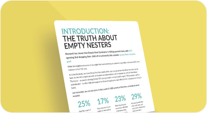 INTRODUCTION: THE TRUTH ABOUT EMPTY NESTERS “It was a strange experience dropping Anwen off - I felt a combination of emotions - excitement, curiosity, fear, sadness, worry and dread. I cried a little on the way home. Back at home and going into her empty bedroom - I felt a sense of real loss... of emptiness. There is a loneliness without her in the house.” Angharad, from Swansea who dropped her daughter of at UWE Bristol in September 2025 Just remember, you are not alone. In fact, a poll of 1,000 parents of first-time university students revealed: While this heightened sense of loss might feel overwhelming as a parent or guardian, rest assured it’s very common to feel this way. At Unite Students, we know those first few weeks after your young person has flown the nest can be hard. As the UK’s largest provider of student accommodation, we’ve teamed up with Dr Dominique Thompson - an award-winning former GP, young people’s mental health expert, TEDx speaker, author and educator - to offer help and support to those struggling to cope without their young person living at home. Research has shown that Empty Nest Syndrome is hitting parents hard, with 83% agreeing that dropping their child off at university this autumn caused them extreme grief. 25% 17% 23% 29% Feel like a part of them is missing Fear what the future holds for themselves Wish they’d spent more time with their child before they went to university Are arguing with their other half more, and worry their relationship will break down “I am so happy she is pursuing her dream of becoming an architect, but she’s left a big hole in our lives. I can’t help feeling very sad that I won’t see her as much. I keep telling myself - this is her life, her time to grow up and just have a great time. I am already looking forward to seeing her again. I haven’t ruled out driving up to Reading just to take her out to lunch!” Steven, a father of two who dropped his youngest child, Martha, off at Reading university this year