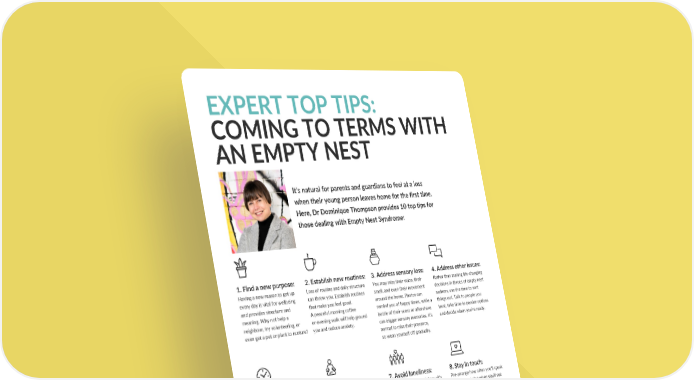 It’s natural for parents and guardians to feel at a loss when their young person leaves home for the first time. Here, Dr Dominique Thompson provides 10 top tips for those dealing with Empty Nest Syndrome: EXPERT TOP TIPS: COMING TO TERMS WITH AN EMPTY NEST About Dr Dominique Thompson Dr Dominique is an award-winning former GP, young people's mental health expert, TEDx speaker and author with over two decades of NHS clinical experience. As an independent mental health consultant, she holds roles including; President of the Student Health Association, membership of the UK government’s Higher Education Mental Health Implementation Taskforce, and Clinical Advisor to NICE and Student Minds. 9. Don’t guilt them: Instead, let them know they’re missed. Send a picture of their empty room with a joke about how tidy it is, rather than a crying face emoji! They’ll know that you miss them but want to feel reassured that you’re coping. 10. Ask for help: If you’re still struggling after four to six weeks, try not to overburden your young person with worries. Talk to your support network and ask your GP for help. You’re not alone - help is out there. 5. Give it time: If the loss of their presence feels like a bereavement, remember it takes time to adjust and recover. However, as with grief, it happens in small steps, and you might need support to get there. 6. Focus on you: Take time to address health issues, tackle weight loss, increase fitness, investigate a hobby, or learn something new. 7. Avoid loneliness: Actively plan to spend time with your family, friends or partner. Make sure you see or speak to someone every day if you need companionship. 8. Stay in touch: Pre-arrange how often you’ll speak to them, and plan when you’ll see them next. For anything in- between, set up a WhatsApp group for pictures and banter. 1. Find a new purpose: Having a new reason to get up every day is vital for wellbeing and provides structure and meaning. Why not help a neighbour, try volunteering, or even get a pet or plant to nurture? 2. Establish new routines: Loss of routine and daily structure can throw you. Establish routines that make you feel good. A peaceful morning coffee or evening walk will help ground you and reduce anxiety. 3. Address sensory loss: You may miss their voice, their smell, and even their movement around the home. Photos can remind you of happy times, while a bottle of their scent or aftershave can trigger sensory memories. It’s normal to miss their presence, so wean yourself off gradually. 4. Address other issues: Rather than making life-changing decisions in throes of empty nest sadness, use the time to sort things out. Talk to people you trust, take time to ponder options and decide when you’re ready. Further resources and support: Websites www.growingagrownup.com www.savethestudent.org Books ‘How to Grow a Grown Up’ by Dominique Thompson and Fabienne Vailes ‘The Empty Nest: Your Changing Family, Your New Direction’ by Celia Dodd Communities For all parents and carers – Facebook: The Growing a Grown Up private community created by Dr Dominique Thompson For single parents – gingerbread.org.uk/ community/online- forum/topic/empty-nest-cant-stop-crying/