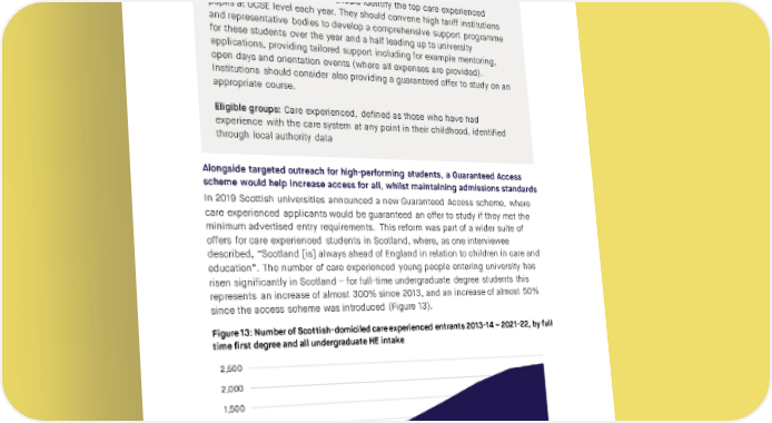SOCIAL MARKET FOUNDATION challenges facing care experienced students, getting more of them into “elite” institutions, with the potential improvements in life chances that entails, is still worthwhile. Recommendation six – targeted support for high-achieving care experienced pupils. The Department for Education should identify the top care experienced pupils at GCSE level each year. They should convene high tariff institutions and representative bodies to develop a comprehensive support programme for these students over the year and a half leading up to university applications, providing tailored support including for example mentoring, open days and orientation events (where all expenses are provided). Institutions should consider also providing a guaranteed offer to study on an appropriate course. Eligible groups: Care experienced, defined as those who have had experience with the care system at any point in their childhood, identified through local authority data Alongside targeted outreach for high-performing students, a Guaranteed Access scheme would help increase access for all, whilst maintaining admissions standards In 2019 Scottish universities announced a new Guaranteed Access scheme, where care experienced applicants would be guaranteed an offer to study if they met the minimum advertised entry requirements. This reform was part of a wider suite of offers for care experienced students in Scotland, where, as one interviewee described, “Scotland [is] always ahead of England in relation to children in care and education”. The number of care experienced young people entering university has risen significantly in Scotland – for full-time undergraduate degree students this represents an increase of almost 300% since 2013, and an increase of almost 50% since the access scheme was introduced (Figure 13). Figure 13: Number of Scottish-domiciled care experienced entrants 2013-14 – 2021-22, by full time first degree and all undergraduate HE intake 2,500 2,000 1,500 1,000 500 0 2013-14 2014-15 2015-16 2016-17 2017-18 2018-19 2019-20 2020-21 2021-22 FT First Degree All UG HE Source: Scottish Funding Council Report on Widening Access 2021-22 60