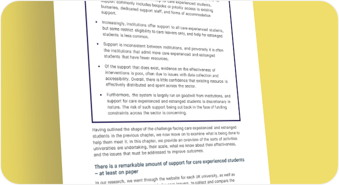SOCIAL MARKET FOUNDATION CHAPTER THREE – WHAT SUPPORT EXISTS FOR CARE EXPERIENCED AND ESTRANGED STUDENTS AND HOW WELL DOES IT WORK? Chapter summary • We estimate that universities collectively spend approximately £10-15 million per year on dedicated help for care experienced students. Support commonly includes bespoke or priority access to existing bursaries, dedicated support staff, and forms of accommodation support. • Increasingly, institutions offer support to all care experienced students, but some restrict eligibility to care leavers only, and help for estranged students is less common. • Support is inconsistent between institutions, and perversely it is often the institutions that admit more care experienced and estranged students that have fewer resources. • Of the support that does exist, evidence on the effectiveness of interventions is poor, often due to issues with data collection and accessibility. Overall, there is little confidence that existing resource is effectively distributed and spent across the sector. • Furthermore, the system is largely run on goodwill from institutions, and support for care experienced and estranged students is discretionary in nature. The risk of such support being cut back in the face of funding constraints across the sector is concerning. Having outlined the shape of the challenge facing care experienced and estranged students in the previous chapter, we now move on to examine what is being done to help them meet it. In this chapter, we provide an overview of the sorts of activities universities are undertaking, their scale, what we know about their effectiveness, and the issues that must be addressed to improve outcomes. There is a remarkable amount of support for care experienced students – at least on paper In our research, we went through the website for each UK university, as well as Propel, the online university guide for care leavers, to collect and compare the different forms of support on offer for care leavers. On the face of it, there is a lot. Figure 11 shows the number of institutions offering differing forms of support. Note that these are likely to be an undercount, as some universities may provide forms of support without having advertised them explicitly. Some things are near enough universal. Basically every university we looked at claimed to offer specialised academic support. More impressively, almost all provide 34