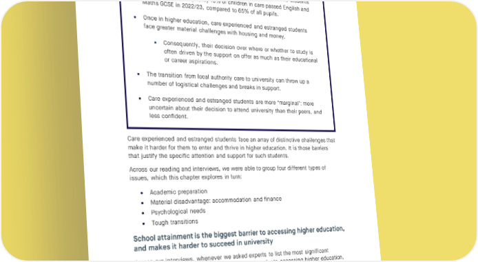 SOCIAL MARKET FOUNDATION CHAPTER TWO – WHAT ARE THE BARRIERS TO CARE EXPERIENCED AND ESTRANGED STUDENTS SUCCEEDING IN HIGHER EDUCATION? Chapter summary • School attainment is the biggest barrier for care experienced students accessing university. Only 19% of children in care passed English and Maths GCSE in 2022/23, compared to 65% of all pupils. • Once in higher education, care experienced and estranged students face greater material challenges with housing and money. • Consequently, their decision over where or whether to study is often driven by the support on offer as much as their educational or career aspirations. • The transition from local authority care to university can throw up a number of logistical challenges and breaks in support. • Care experienced and estranged students are more ‘marginal’: more uncertain about their decision to attend university than their peers, and less confident. Care experienced and estranged students face an array of distinctive challenges that make it harder for them to enter and thrive in higher education. It is those barriers that justify the specific attention and support for such students. Across our reading and interviews, we were able to group four different types of issues, which this chapter explores in turn: • Academic preparation • Material disadvantage: accommodation and finance • Psychological needs • Tough transitions School attainment is the biggest barrier to accessing higher education, and makes it harder to succeed in university Across our interviews, whenever we asked experts to list the most significant obstacles for care experienced and estranged students accessing higher education, invariably the first thing they raised was prior school attainment at traditional key stage transitions. “In terms of increasing the proportion of care experienced young people going on to higher education, the single biggest thing can do is improve their attainment at 16. By that point in the conveyor belt, or whatever metaphor you want to use, everything is pretty much fixed.” Academic 22