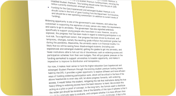 SOCIAL MARKET FOUNDATION services and interventions. The reason is that we want to use the funding to foster a culture of innovation and experimentation in support for these students, as well as incentivising institutions to follow evidenced practice. Given the different contexts, it is appropriate that these grants are funded separately for FE and HE. We propose: • The £12 million for the Care Experienced and estranged Student Premium in HE should form part of the OfS Student Premium funding stream, mirroring the Disabled Student Premium. This funding should come from the pot of £240 million currently distributed amongst providers. • Funding for the Care Experienced and estranged Student Premium in FE should come in the form of grant funding from the Department for Education, and should be a new spending commitment (in addition to current levels of funding). Widening opportunity is one of the government’s core missions, and Labour has committed to supporting the aspiration of every person who meets the requirements and wants to go to university. The government has also signalled ambitions specifically to support young people who have been in care. However, as we’ve explored, the progress that has been made in regard to widening participation in HE is at risk. To a significant extent, that progress has been driven by structural, and temporary, changes, namely the resulting grade inflation that predicted grades had during the pandemic. Meanwhile, the university sector is in financial trouble. It is likely that we will be seeing fewer disadvantaged students (including care experienced and estranged students) getting the grades to get into university, and fewer institutions able to fork out lots of discretionary cash on widening access and participation schemes from their own budgets. That will put greater pressure on the funding earmarked to support universities to broaden opportunity, and makes it imperative to improve its distribution and transparency. For now, it makes most sense to fund the higher education Care Experienced and estranged Student Premium through the existing student premium funding stream, held by the OfS. It provides a great opportunity to explore different and more efficient ways of funding widening participation work, which will be critical in the face of the above headwinds to even stay still, let alone progress forwards, with widening access. It would follow the student, mitigating the risk that institutions doing the true heavy lifting in widening access have the least resource to hand. We envision this acting as a pilot or proof of concept; in the long-term, the formula used to distribute the wider pot should be reviewed. One of the benefits of this type of scheme is that it should be relatively easy to evaluate, and compare whether it is more efficient than how widening access and participation funds are currently distributed. If that is the case, then restructuring the whole balance to be distributed via simultaneous Student Premium type schemes, adding other particular ‘at risk’ or ‘resource intensive’ student groups, could be a more efficient and fair way of distributing funding across the sector. It is likely that at some point the pot will need to increase in size – but it will be a pot that is more targeted, efficiently spent, and hopefully, an effective contributor to the government’s broader mission of opportunity. 48