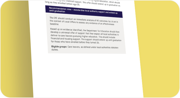 SOCIAL MARKET FOUNDATION Prime Minister recently promised that young care leavers would have a “guaranteed roof over their head” and “the security they deserve”.100 There is clearly a need to both standardise local authority support for care leavers and for the age of eligibility to be extended. The Department for Education should undertake an immediate analytical review of outcomes for care leaver students by local offer, and then utilise this learning to develop a universal offer of support for local authorities to deliver to care leavers pursuing higher education, which should include housing and financial support. This offer should extend up to graduation as long as they enrolled before age 25. Recommendation nine – standardise local authority support and extend up until graduation The DfE should conduct an immediate analysis of HE outcomes by LA set in the context of Local Offers to assess any evidence of an effectiveness baseline Based up on evidence identified, the Department for Education should then develop a universal offer of support that they expect all local authorities to deliver to care leavers pursuing higher education. This should include financial and housing support. The support should extend up until graduation for those who have enrolled before they turned 25. Eligible groups: Care leavers, as defined under local authorities statutory duties. 66