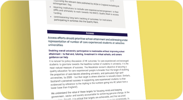 SOCIAL MARKET FOUNDATION information adds value to university provision, removing their need to search for relevant students or deploy application systems. Recommendation three - supporting the development of evidence-led good practice Support the development of evidence-led good practice, including by • expanding the relevant data published by HESA in England including an estrangement flag • requiring institutions to include care experience/estrangement in their APPs and ultimately to work towards the NNECL Quality Mark to access funding • commissioning long term tracking of outcomes for institutions participating in schemes like the Quality Mark. Access Access efforts should prioritise school attainment and addressing under representation of number of care experienced students at selective universities Doubling overall university participation is inadvisable without improving school attainment – to that end, tutoring, investment in virtual schools, and careers guidance can help It is natural for policy discussion of HE outcomes for care experienced and estranged students to gravitate towards the headline number of students in university. It is the most natural measure of success. The MacAlister review’s objective of securing a quality education for care experienced people is broader than the target of doubling the proportion of care leavers attending university, and particularly high tariff universities, by 2026 – but that target is where attention is naturally drawn. Similarly, Scotland’s perceived success in supporting care experienced students is often evidenced by reference to the tripling in the numbers going into HE (albeit from a lower base than England). We understand the value of these targets for focusing minds and keeping government, sector and society accountable for achieving genuine change. At the same time, though, it is critical that targets are achievable, and that we avoid perverse consequences that could result from pursuing them too aggressively. In Chapter Two we described how almost every expert we spoke to believes that school attainment is the biggest barrier to HE access for care experienced and estranged people, and presented some of the statistics on school performance that backs up their view. We also presented the evidence that care experienced students are often among the most marginal – least certain as to why they are going to university, and that university is for them. 54