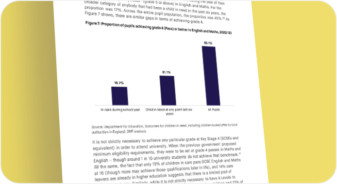 CARE AND LEARNING IN HIGHER EDUCATION “In the literature [the barrier to access] is very much qualification level. Care experienced people are less likely to have the qualifications to access universities because of disrupted schooling, moving around different homes, changing schools.” Academic Due to their adverse childhood experience, not enough care experienced and estranged young people get the grades to get in to university, and to do well when they are there. In 2022/23, 9% of children who were in care during the year of their GCSEs achieved “good passes” (grade 5 or above) in English and Maths. For the broader category of anybody that had been a child in need in the past six years, the proportion was 17%. Across the entire pupil population, the proportion was 45%.26 As Figure 7 shows, there are similar gaps in terms of achieving grade 4. Figure 7: Proportion of pupils achieving grade 4 (Pass) or better in English and Maths, 2022/23 65.1% 31.1% 18.7% In care during school year Child in Need at any point last six All Pupils years Source: Department for Education, Outcomes for children in need, including children looked after by local authorities in England; SMF analysis It is not strictly necessary to achieve any particular grade at Key Stage 4 (GCSEs and equivalent) in order to attend university. When the previous government proposed minimum eligibility requirements, they were to be set at grade 4 passes in Maths and 27 English – though around 1 in 10 university students do not achieve that benchmark. All the same, the fact that only 19% of children in care pass GCSE English and Maths at 16 (though more may achieve those qualifications later in life), and 14% care leavers are already in higher education suggests that there is a limited pool of qualified students. Similarly, while it is not strictly necessary to have A Levels to attend university, the fact that an estimated 15% of looked after children and 22% of care experienced young people study for A Levels, suggests a limited pipeline.28 Without a substantial improvement in performance, achieving the MacAlister review’s ambition of doubling care leavers in higher education looks challenging to say the least. These differences in school grades account for the vast majority of the gap in higher education participation between care leaver and other students. According to 23