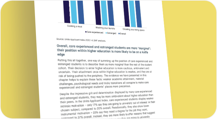 CARE AND LEARNING IN HIGHER EDUCATION Figure 9: Proportion of applicants who said they would be confident doing the following activities tomorrow 81% 85% 76% 79% 70% 71% 68% 71% 71% Cooking a meal Washing your laundry Cleaning your living space Care experienced Estranged Overall Source: Unite Applicant Index 2023-4; SMF analysis. Overall, care experienced and estranged students are more ‘marginal’: their position within higher education is more likely to be on a knife edge Putting this all together, one way of summing up the position of care experienced and estranged students is to describe them as more marginal than the rest of the student cohort. Their decision to enter higher education is more cautious, ambivalent and uncertain. Their attachment once within higher education is weaker, and they are at risk of being pushed to the periphery. The evidence we have presented in this chapter helps to explain these facts: weaker academic attainment, material challenges, psychological needs and tricky transitions all conspire to make care experienced and estranged students’ places more precarious. Despite the impressive grit and determination displayed by many care experienced and estranged students, they may be more ambivalent about higher education than their peers. In the Unite Applicant Index, care experienced students display weaker intrinsic motivation – only 17% say they are going to university out of interest in their chosen subject, compared to 35% overall. Paradoxically, they also show lower instrumental motivation – 22% say they need a degree for the job they want, compared to 37% overall. Instead, they are more likely to offer reasons that suggest they are being carried by inertia: more of them say they are going to university because it is what their friends are doing or what their family expects. Now, this question was only asked in the 2024 edition of the survey, so should be treated with even greater caution because of small sample size, but it is suggestive and intriguing and warrants further study. 31