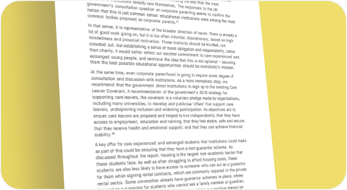 SOCIAL MARKET FOUNDATION highlights efforts to make care experienced and estranged students feel more welcomed and at home, including celebrations like social media campaigns and care leavers’ week events and establishing groups and associations. Corporate parenting in Scotland has not created a new playbook or set of duties for institutions, but it has given them impetus to do what the most engaged and enthusiastic were doing anyway. That reflects the nature of the move – less radical than it might seem, merely confirming and endorsing the way that the most progressive institutions already saw themselves. The responses to the UK government’s consultation question on corporate parenting seems to confirm the notion that this is just common sense: educational institutions were among the most common bodies proposed as corporate parents.97 In that sense, it is representative of the broader direction of travel. There is already a lot of good work going on, but it is too often informal, discretionary, based on high mindedness and prosocial motivation. Those instincts should be kindled, not crowded out. But establishing a sense of moral obligation and responsibility, rather than charity, it would better reflect our societal commitment to care experienced and estranged young people, and reinforce the idea that this is not optional – securing them the best possible educational opportunities should be everybody’s mission. At the same time, even corporate parenthood is going to require some degree of consultation and discussion with institutions. As a more immediate step, we recommend that the government direct institutions to sign up to the existing Care Leaver Covenant. A recommendation of the government’s 2016 strategy for supporting care leavers, the covenant is a voluntary pledge made by organisations, including many universities, to develop and publicise ‘offers’ that support care leavers, underpinning inclusion and widening participation. Its objectives are to ensure care leavers are prepared and helped to live independently; that they have access to employment, education and training; that they feel stable, safe and secure; that they receive health and emotional support; and that they can achieve financial stability.98 A key offer for care experienced and estranged students that institutions could make as part of this could be ensuring that they have a rent guarantor scheme. As discussed throughout the report, housing is the largest non-academic barrier that these students face. As well as often struggling to afford housing costs, these students are also less likely to have access to someone who can act as a guarantor for them when signing rental contracts, which are commonly required in the private rental sector. Some universities already have guarantor schemes in place, where they act as a guarantor for students who cannot ask a family member or guardian. Making this common practice across the sector would have a positive impact on these groups of students, helping them to find secure accommodation close to their study location. Other organisations, such as Purpose-Built Student Accommodation providers, should also be encouraged to waive requirements for a guarantor for these groups. 64