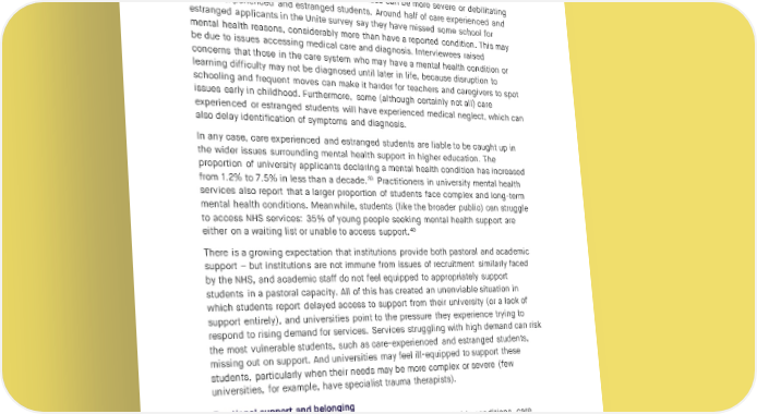 SOCIAL MARKET FOUNDATION reported anxiety out of 10 (where 10 is greater) was 5.3 for those who had been in local authority care compared to 4.5 for those who had not been, and 5.0 for estranged students versus 4.45 for those who were not estranged.38 Although, of course, it is important to note that this could also reflect differences in mental health between applicants (the sample drawn from for the Unite Index) and current students (HEPI’s Student Academic Survey). However, it does seem that mental health issues can be more severe or debilitating for care experienced and estranged students. Around half of care experienced and estranged applicants in the Unite survey say they have missed some school for mental health reasons, considerably more than have a reported condition. This may be due to issues accessing medical care and diagnosis. Interviewees raised concerns that those in the care system who may have a mental health condition or learning difficulty may not be diagnosed until later in life, because disruption to schooling and frequent moves can make it harder for teachers and caregivers to spot issues early in childhood. Furthermore, some (although certainly not all) care experienced or estranged students will have experienced medical neglect, which can also delay identification of symptoms and diagnosis. In any case, care experienced and estranged students are liable to be caught up in the wider issues surrounding mental health support in higher education. The proportion of university applicants declaring a mental health condition has increased from 1.2% to 7.5% in less than a decade.39 Practitioners in university mental health services also report that a larger proportion of students face complex and long-term mental health conditions. Meanwhile, students (like the broader public) can struggle to access NHS services: 35% of young people seeking mental health support are either on a waiting list or unable to access support.40 There is a growing expectation that institutions provide both pastoral and academic support – but institutions are not immune from issues of recruitment similarly faced by the NHS, and academic staff do not feel equipped to appropriately support students in a pastoral capacity. All of this has created an unenviable situation in which students report delayed access to support from their university (or a lack of support entirely), and universities point to the pressure they experience trying to respond to rising demand for services. Services struggling with high demand can risk the most vulnerable students, such as care-experienced and estranged students, missing out on support. And universities may feel ill-equipped to support these students, particularly when their needs may be more complex or severe (few universities, for example, have specialist trauma therapists). Emotional support and belonging Quite apart from formal mental health treatment for diagnosable conditions, care experienced and estranged students may have particular psychological needs to be met if they are to thrive in higher education. It is common to hear stories about their struggle to fit in, and feel comfortable, understood and wanted, in what can be a novel and sometimes alienating environment. This interacts with the issues we raised above. Having less money – or feeling like you have less money – than your peers has obvious consequences for how included you feel. Living and distant from 28