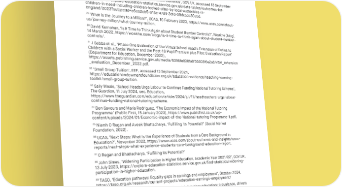 CARE AND LEARNING IN HIGHER EDUCATION September 2024, https://register-of-charities.charitycommission.gov.uk/charity-search/- /charity-details/5154824. 76 Frank Young and Danniel Lilley, ‘Breaking the Care Ceiling’ (Civitas, September 2023), https://www.civitas.org.uk/content/files/Breaking-the-care-ceiling.pdf. 77 ‘Applicant Index Report’, Unite Students, 15 July 2024, https://www.unitegroup.com/applicant-index-report. 78 Department for Education, ‘Explore Education Statistics’, GOV.UK, accessed 13 September 2024, https://explore-education-statistics.service.gov.uk/data-tables/outcomes-for- children-in-need-including-children-looked-after-by-local-authorities-in- england/2023?subjectId=e6c62cb5-618e-47d4-3dfd-08dc53c3028d. 79 ‘What Is the Journey to a Million?’, UCAS, 10 February 2023, https://www.ucas.com/about- us/journey-million/what-journey-million. 80 David Kernohan, ‘Is It Time to Think Again about Student Number Controls?’, Wonkhe (blog), 14 March 2022, https://wonkhe.com/blogs/is-it-time-to-think-again-about-student-number- controls/. 81 J Sebba et al., ‘Phase One Evaluation of the Virtual School Head’s Extension of Duties to Children with a Social Worker and the Post-16 Pupil Premium plus Pilot: Evaluation Report’ (Department for Education, December 2022), https://assets.publishing.service.gov.uk/media/6396fe808fa8f55303f6e2a8/VSH_extension _evaluation_December_2022.pdf. 82 ‘Small Group Tuition’, EEF, accessed 13 September 2024, https://educationendowmentfoundation.org.uk/education-evidence/teaching-learning- toolkit/small-group-tuition. 83 Sally Weale, ‘School Heads Urge Labour to Continue Funding National Tutoring Scheme’, The Guardian, 11 July 2024, sec. Education, https://www.theguardian.com/education/article/2024/jul/11/headteachers-urge-labour- continue-funding-national-tutoring-scheme. 84 Ben Savours and Maria Rodriguez, ‘The Economic Impact of the National Tutoring Programme’ (Public First, 15 January 2023), https://www.publicfirst.co.uk/wp- content/uploads/2024/01/Economic-impact-of-the-National-tutoring-Programme-1.pdf. 85 Niamh O Regan and Aveek Bhattacharya, ‘Fulfilling Its Potential?’ (Social Market Foundation, 2022). 86 UCAS, ‘Next Steps: What Is the Experience of Students from a Care Background in Education?’, November 2022, https://www.ucas.com/about-us/news-and-insights/ucas- reports/next-steps-what-experience-students-care-background-education-report. 87 O Regan and Bhattacharya, ‘Fulfilling Its Potential?’ 88 John Simes, ‘Widening Participation in Higher Education, Academic Year 2021/22’, GOV.UK, 13 July 2023, https://explore-education-statistics.service.gov.uk/find-statistics/widening- participation-in-higher-education. 89 TASO, ‘Education pathways: Equality gaps in earnings and employment’, October 2024, https://taso.org.uk/research/current-projects/education-earnings-employment/ 90 Campbell, S., Macmillan, L., Wyness, G. ‘Mismatch in higher education: prevalence, drivers and outcomes’, December 2019, https://www.nuffieldfoundation.org/wp- content/uploads/2019/11/Wyness-42856-Executive-Summary-Nov19.pdf 91 UCAS, ‘Undergraduate end of cycle data resources 2023’, https://www.ucas.com/data- and-analysis/undergraduate-statistics-and-reports/ucas-undergraduate-end-cycle-data- resources-2023 71