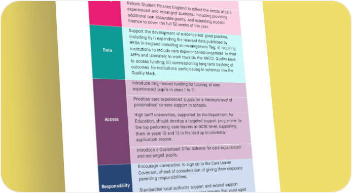 CARE AND LEARNING IN HIGHER EDUCATION 25 reflecting educational disruption and comparatively low attainment at key stage transitions Recommendations Introduce a care experienced and estranged Student Premium scheme, offering institutions grant funding for each enrolled student. Funding Reform Student Finance England to reflect the needs of care experienced and estranged students, including providing additional non-repayable grants, and extending student finance to cover the full 52 weeks of the year. Support the development of evidence-led good practice, including by i) expanding the relevant data published by HESA in England including an estrangement flag; ii) requiring Data institutions to include care experience/estrangement in their APPs and ultimately to work towards the NNECL Quality Mark to access funding; iii) commissioning long term tracking of outcomes for institutions participating in schemes like the Quality Mark. Introduce ring-fenced funding for tutoring of care experienced pupils in years 1 to 11. Prioritise care experienced pupils for a minimum level of personalised careers support in schools. Access High tariff universities, supported by the Department for Education, should develop a targeted support programme for the top performing care leavers at GCSE level, supporting them in years 12 and 13 in the lead up to university application season. Introduce a Guaranteed Offer Scheme for care experienced and estranged pupils. Encourage universities to sign up to the Care Leaver Covenant, ahead of consideration of giving them corporate parenting responsibilities. Responsibility Standardise local authority support and extend support through to graduation for those care leavers that enrol aged 25 or under. 11