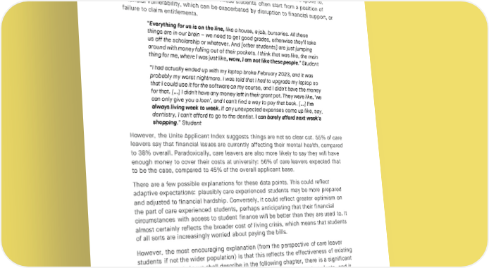 SOCIAL MARKET FOUNDATION they were entitled to at graduation and do not have sufficient support from other sources to secure stable housing and progress into work or further study.35 Financial insecurity Financial challenges, especially when care experienced and estranged students were not receiving accommodation support, came up regularly across our interviews, including some troubling and harrowing testimony from the students we spoke to, and from those who work with them. These students often start from a position of financial vulnerability, which can be exacerbated by disruption to financial support, or failure to claim entitlements. “Everything for us is on the line, like a house, a job, bursaries. All these things are in our brain – we need to get good grades, otherwise they'll take us off the scholarship or whatever. And [other students] are just jumping around with money falling out of their pockets. I think that was like, the main thing for me, where I was just like, wow, I am not like these people.” Student “I had actually ended up with my laptop broke February 2023, and it was probably my worst nightmare. I was told that I had to upgrade my laptop so that I could use it for the software on my course, and I didn't have the money for that. […] I didn't have any money left in their grant pot. They were like, ‘we can only give you a loan’, and I can't find a way to pay that back. […] I’m always living week to week. If any unexpected expenses come up like, say, dentistry, I can't afford to go to the dentist. I can barely afford next week's shopping.” Student However, the Unite Applicant Index suggests things are not so clear cut. 55% of care leavers say that financial issues are currently affecting their mental health, compared to 38% overall. Paradoxically, care leavers are also more likely to say they will have enough money to cover their costs at university: 56% of care leavers expected that to be the case, compared to 45% of the overall applicant base. There are a few possible explanations for these data points. This could reflect adaptive expectations: plausibly care experienced students may be more prepared and adjusted to financial hardship. Conversely, it could reflect greater optimism on the part of care experienced students, perhaps anticipating that their financial circumstances with access to student finance will be better than they are used to. It almost certainly reflects the broader cost of living crisis, which means that students of all sorts are increasingly worried about paying the bills. However, the most encouraging explanation (from the perspective of care leaver students if not the wider population) is that this reflects the effectiveness of existing financial support. As we shall describe in the following chapter, there is a significant amount of relatively generous funding on offer for care experienced students, and it is plausible that this is cushioning the blow more effectively than for the rest of their cohorts. There is some evidence for this theory in the Higher Education Policy Institute’s Student Academic Experience Survey. Figure 8 shows the different sources of income students report using to cover their living costs. Care experienced students are much more likely to report receiving scholarships and studentships (26% to 15% overall), and less likely to rely exclusively on maintenance loans. 26