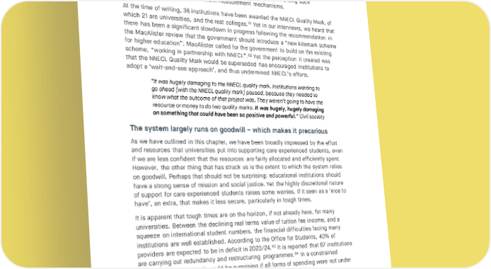 SOCIAL MARKET FOUNDATION The Quality Mark suffers from similar evidentiary challenges to other initiatives to support care experienced and estranged students. It is perhaps most accurate to say that institutions are evaluated on interventions that represent our ‘best guess’ at what works to help care experienced and estranged students, as opposed to evidence-based best practice. Similarly, institutions do not have to evidence improved outcomes for the students benefiting from the above interventions. The central challenge in this area is the lack of accessible data preventing such assessments and lack of consistent measurement mechanisms. At the time of writing, 38 institutions have been awarded the NNECL Quality Mark, of which 21 are universities, and the rest colleges.61 Yet in our interviews, we heard that there has been a significant slowdown in progress following the recommendation in the MacAlister review that the government should introduce a “new kitemark scheme for higher education”. MacAlister called for the government to build on the existing scheme, “working in partnership with NNECL”.62 Yet the perception it created was that the NNECL Quality Mark would be superseded has encouraged institutions to adopt a ‘wait-and-see approach’, and thus undermined NNECL’s efforts. “It was hugely damaging to the NNECL quality mark. Institutions wanting to go ahead [with the NNECL quality mark] paused, because they needed to know what the outcome of that project was. They weren’t going to have the resource or money to do two quality marks. It was hugely, hugely damaging on something that could have been so positive and powerful.” Civil society The system largely runs on goodwill – which makes it precarious As we have outlined in this chapter, we have been broadly impressed by the effort and resources that universities put into supporting care experienced students, even if we are less confident that the resources are fairly allocated and efficiently spent. However, the other thing that has struck us is the extent to which the system relies on goodwill. Perhaps that should not be surprising: educational institutions should have a strong sense of mission and social justice. Yet the highly discretional nature of support for care experienced students raises some worries. If it seen as a ‘nice to have’, an extra, that makes it less secure, particularly in tough times. It is apparent that tough times are on the horizon, if not already here, for many universities. Between the declining real terms value of tuition fee income, and a squeeze on international student numbers, the financial difficulties facing many institutions are well established. According to the Office for Students, 40% of providers are expected to be in deficit in 2023/24.63 It is reported that 67 institutions are carrying out redundancy and restructuring programmes.64 In a constrained financial environment, it would be surprising if all forms of spending were not under the microscope. On the other hand, many people we spoke too were more sanguine. Support for care experienced students is effectively a rounding error in university budgets, 1/3000th of the sector’s overall £44 billion turnover.65 Would it really be worth cutting back, especially when universities have made such public commitments to care experienced students? 42