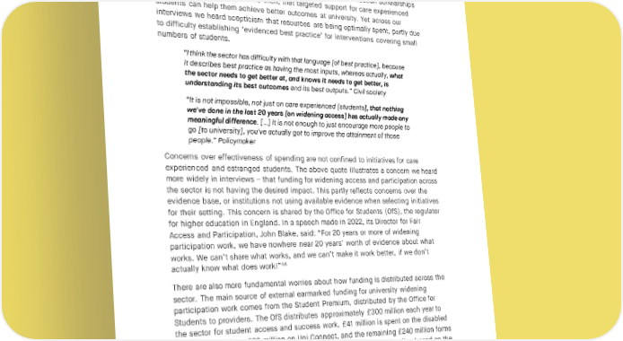SOCIAL MARKET FOUNDATION To some extent, those raw numbers above reflect the fact that Unite scholarship students in the sample were more likely to be at Russell Group universities. However, the data was controlled for known factors of prior attainment, gender and Russell Group attendance, finding that these were not driving components. Whilst Unite Foundation scholarship students did better than their care leaver peers in any setting, it was male scholars at universities outside the selective Russell Group that travelled the greatest distance. The evidence of the Unite Foundation scholarships should give us encouragement, then, that targeted support for care experienced students can help them achieve better outcomes at university. Yet across our interviews we heard scepticism that resources are being optimally spent, partly due to difficulty establishing ‘evidenced best practice’ for interventions covering small numbers of students. “I think the sector has difficulty with that language [of best practice], because it describes best practice as having the most inputs, whereas actually, what the sector needs to get better at, and knows it needs to get better, is understanding its best outcomes and its best outputs.” Civil society “It is not impossible, not just on care experienced [students], that nothing we've done in the last 20 years [on widening access] has actually made any meaningful difference. […] It is not enough to just encourage more people to go [to university], you've actually got to improve the attainment of those people.” Policymaker Concerns over effectiveness of spending are not confined to initiatives for care experienced and estranged students. The above quote illustrates a concern we heard more widely in interviews – that funding for widening access and participation across the sector is not having the desired impact. This partly reflects concerns over the evidence base, or institutions not using available evidence when selecting initiatives for their setting. This concern is shared by the Office for Students (OfS), the regulator for higher education in England. In a speech made in 2022, its Director for Fair Access and Participation, John Blake, said: “For 20 years or more of widening participation work, we have nowhere near 20 years’ worth of evidence about what works. We can’t share what works, and we can’t make it work better, if we don’t actually know what does work!”56 There are also more fundamental worries about how funding is distributed across the sector. The main source of external earmarked funding for university widening participation work comes from the Student Premium, distributed by the Office for Students to providers. The OfS distributes approximately £300 million each year to the sector for student access and success work. £41 million is spent on the disabled students’ premium, £20 million on Uni Connect, and the remaining £240 million forms the Student Premium funding streams.57 Providers are allocated funding based on the proportion of students they admit who are deemed ‘high risk’ of withdrawing, for which the OfS draws on age, entry tariff and POLAR quintiles.58 Interviewees had two fundamental concerns about the effectiveness of these funding streams: the criteria, and the distribution. Interviewees queried whether the criteria for the funding (how they deem a student ‘high risk’) was appropriate. One interviewee went as far as to say that “the student 40