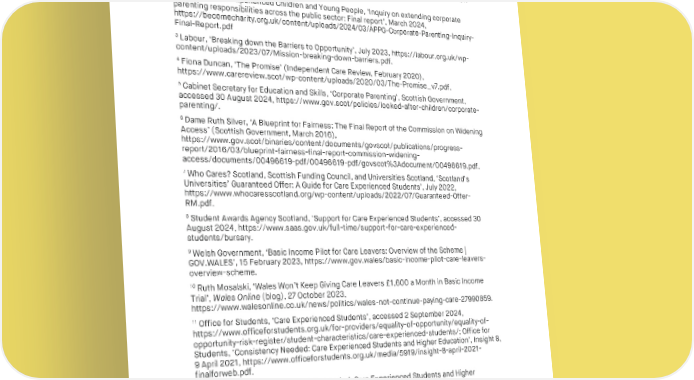 CARE AND LEARNING IN HIGHER EDUCATION ENDNOTES 1 Josh MacAlister, ‘The Independent Review of Children’s Social Care: Final Report’ (Department for Education, May 2022), https://webarchive.nationalarchives.gov.uk/ukgwa/20230308122535mp_/https://childrens socialcare.independent-review.uk/wp-content/uploads/2022/05/The-independent-review- of-childrens-social-care-Final-report.pdf. 2 APPG for Care-Experienced Children and Young People, ‘Inquiry on extending corporate parenting responsibilities across the public sector: Final report’, March 2024, https://becomecharity.org.uk/content/uploads/2024/03/APPG-Corporate-Parenting-Inquiry- Final-Report.pdf 3 Labour, ‘Breaking down the Barriers to Opportunity’, July 2023, https://labour.org.uk/wp- content/uploads/2023/07/Mission-breaking-down-barriers.pdf. 4 Fiona Duncan, ‘The Promise’ (Independent Care Review, February 2020), https://www.carereview.scot/wp-content/uploads/2020/03/The-Promise_v7.pdf. 5 Cabinet Secretary for Education and Skills, ‘Corporate Parenting’, Scottish Government, accessed 30 August 2024, https://www.gov.scot/policies/looked-after-children/corporate- parenting/. 6 Dame Ruth Silver, ‘A Blueprint for Fairness: The Final Report of the Commission on Widening Access’ (Scottish Government, March 2016), https://www.gov.scot/binaries/content/documents/govscot/publications/progress- report/2016/03/blueprint-fairness-final-report-commission-widening- access/documents/00496619-pdf/00496619-pdf/govscot%3Adocument/00496619.pdf. 7 Who Cares? Scotland, Scottish Funding Council, and Universities Scotland, ‘Scotland’s Universities’ Guaranteed Offer: A Guide for Care Experienced Students’, July 2022, https://www.whocaresscotland.org/wp-content/uploads/2022/07/Guaranteed-Offer- RM.pdf. 8 Student Awards Agency Scotland, ‘Support for Care Experienced Students’, accessed 30 August 2024, https://www.saas.gov.uk/full-time/support-for-care-experienced- students/bursary. 9 Welsh Government, ‘Basic Income Pilot for Care Leavers: Overview of the Scheme | GOV.WALES’, 15 February 2023, https://www.gov.wales/basic-income-pilot-care-leavers- overview-scheme. 10 Ruth Mosalski, ‘Wales Won’t Keep Giving Care Leavers £1,600 a Month in Basic Income Trial’, Wales Online (blog), 27 October 2023, https://www.walesonline.co.uk/news/politics/wales-not-continue-paying-care-27990859. 11 Office for Students, ‘Care Experienced Students’, accessed 2 September 2024, https://www.officeforstudents.org.uk/for-providers/equality-of-opportunity/equality-of- opportunity-risk-register/student-characteristics/care-experienced-students/; Office for Students, ‘Consistency Needed: Care Experienced Students and Higher Education’, Insight 8, 9 April 2021, https://www.officeforstudents.org.uk/media/5919/insight-8-april-2021- finalforweb.pdf. 12 Office for Students, ‘Consistency Needed: Care Experienced Students and Higher Education’. 13 MacAlister, ‘The Independent Review of Children’s Social Care: Final Report’. 14 Office for Students, ‘Care Experienced Students’. 15 Office for Students, ‘Consistency Needed: Care Experienced Students and Higher Education’. 67