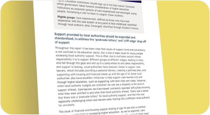 CARE AND LEARNING IN HIGHER EDUCATION The Department for Education should undertake a campaign to raise awareness and sign ups to the covenant. As well as institutions, this should include charities, funders, commercial suppliers, graduate employers and local authorities. Recommendation eight – Direct Higher Education institutions to sign up to the Care Leaver Covenant, ahead of any consideration of corporate parenting of care experienced and estranged young people Higher Education institutions should sign up to the Care Leaver Covenant whilst government takes forward consideration of higher education institutions as corporate parents of care experienced and estranged young people, formalising a role for them to support these students. Eligible groups: Care experienced, defined as those who have had experience with the care system at any point in their childhood, identified through local authority data; Estranged, identified through Student Finance. Support provided by local authorities should be expanded and standardised, to address the ‘postcode lottery’ and ‘cliff-edge’ drop off of support Throughout this report it has been clear that issues of support level and consistency is not confined to the education sector, but is also a major issue for young people accessing local authority support. This is often due to confusion around whose responsibility it is to support different groups at different stages, leading to many who fall through the gaps and end up in a camp where no one takes responsibility, and support is lacking. Local authorities have statutory duties to support care leavers, which includes providing a personal advisor, creating a pathway plan, and supporting with housing and financial needs up until the age of 18. Some local authorities also have excellent initiatives to help support care leavers into and through higher education, such as supporting with term time rent costs. However, when local authority budgets are stretched we can see a disparity in the level of support offered. Care leavers we interviewed commonly reported difficulties knowing what they were entitled to and what their local authority offered. There was a sense that there was a ‘postcode lottery’ for local authority support, and that this was especially challenging when care leavers were moving into a different local authority for university. The issue of financial and housing support ending at age 18 was also a common challenge, particularly in accessing higher education. As we’ve explored, care leavers are more likely to go into higher education later in life, and will likely need similar levels of support progressing into higher education as a care leaver applying straight out of compulsory schooling. This ‘cliff-edge’ drop off of support can be devastating for care leavers: a report in 2023 found that 1 in 10 care leavers were homeless or threatened with homelessness after the end of the local authority statutory duty at 18.99 This is an issue that the government has acknowledged: the 65