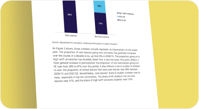 SOCIAL MARKET FOUNDATION access to elite universities: in 2021/22, only 2% of care leavers were admitted to the most selective ‘high tariff’ universities, compared to 14% of non-care leavers. Figure 2: Destination of 19 year olds, England 2021/22 2% 12% 14% 33% High Tariff institution 86% Other HE Not in HE 53% Care Leavers Non Care Leavers Source: Department for Education, Widening Participation in Higher Education As Figure 3 shows, those numbers actually represent an improvement on the recent past. The proportion of care leavers going onto university has gradually increased over the course of a decade or so, up from 9% in 2009/10. The proportion going on to high tariff universities has doubled, albeit from a very low base. This partly reflects a more general increase in participation: the proportion of non care leavers going into HE rose from 34% to 47% over this period. It also reflects a rise in number of children in care: the proportion of school leavers that were care leavers rose 26% between 2009/10 and 2021/22. Nevertheless, care leavers’ share of student numbers rose by more, especially in top tier universities. The share of HE students that are care leavers rose 51%, and the share of high tariff university students rose 113%. 16