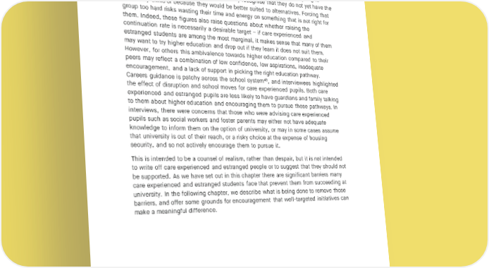 CARE AND LEARNING IN HIGHER EDUCATION potential students that need a bit more of a push to get them over the hump into higher education and on a path towards their future goals. Equally, these figures – combined with what we already know about school attainment and the weaker performance of care experienced and estranged students once they get to university – highlight the risks of pushing too hard. There exists, it seems, a meaningful proportion of students that are on the fence about going to university. For some this will be because they recognise that they do not yet have the necessary skills or because they would be better suited to alternatives. Forcing that group too hard risks wasting their time and energy on something that is not right for them. Indeed, these figures also raise questions about whether raising the continuation rate is necessarily a desirable target – if care experienced and estranged students are among the most marginal, it makes sense that many of them may want to try higher education and drop out if they learn it does not suit them. However, for others this ambivalence towards higher education compared to their peers may reflect a combination of low confidence, low aspirations, inadequate encouragement, and a lack of support in picking the right education pathway. Careers guidance is patchy across the school system49, and interviewees highlighted the effect of disruption and school moves for care experienced pupils. Both care experienced and estranged pupils are less likely to have guardians and family talking to them about higher education and encouraging them to pursue these pathways. In interviews, there were concerns that those who were advising care experienced pupils such as social workers and foster parents may either not have adequate knowledge to inform them on the option of university, or may in some cases assume that university is out of their reach, or a risky choice at the expense of housing security, and so not actively encourage them to pursue it. This is intended to be a counsel of realism, rather than despair, but it is not intended to write off care experienced and estranged people or to suggest that they should not be supported. As we have set out in this chapter there are significant barriers many care experienced and estranged students face that prevent them from succeeding at university. In the following chapter, we describe what is being done to remove those barriers, and offer some grounds for encouragement that well-targeted initiatives can make a meaningful difference. 33