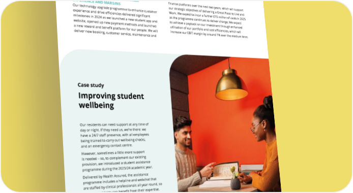 Case study Improving student wellbeing Our residents can need support at any time of day or night. If they need us, we’re there: we have a 24/7 staff presence, with all employees being trained to carry out wellbeing checks, and an emergency contact centre. However, sometimes a little more support is needed – so, to complement our existing provision, we introduced a student assistance programme during the 2023/24 academic year. Delivered by Health Assured, the assistance programme includes a helpline and webchat that are staffed by clinical professionals all year round, so that our residents can benefit from their expertise. Our proactive support work is also important. As of 2024, we have more Resident Ambassadors – students paid at the National Living Wage to create a community and run events in their building – than ever before, providing our residents with valuable peer support and upskilling the Resident Ambassadors through training and experience. STRATEGIC REPORT TECHNOLOGY ENHANCING CUSTOMER EXPERIENCE AND MARGINS Our technology upgrade programme to enhance customer experience and drive efficiencies delivered significant milestones in 2024 as we launched a new student app and website, opened up new payment methods and launched a new reward and benefit platform for our people. We will deliver new booking, customer service, maintenance and finance platforms over the next two years, which will support our strategic objectives of delivering a Great Place to Live and Work. We expect to incur a further £15 million of costs in 2025 as the programme continues to deliver change. We expect to achieve a payback on our investment through enhanced utilisation of our portfolio and cost efficiencies, which will increase our EBIT margin by around 1% over the medium term. PERFORMANCE REVIEW Operations review continued THE UNITE GROUP PLC Annual Report and Accounts 2024 28