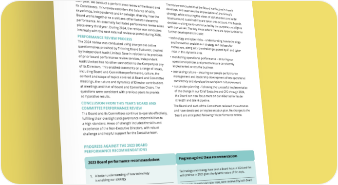 THE UNITE GROUP PLC Annual Report and Accounts 2024 97 2024 PERFORMANCE REVIEW Each year, we conduct a performance review of the Board and its Committees. This review considers the balance of skills, experience, independence and knowledge, diversity, how the Board works together as a unit and other factors relevant to performance. An externally facilitated performance review takes place every third year. During 2024, the review was conducted internally with the next external review expected during 2026. PERFORMANCE REVIEW PROCESS The 2024 review was conducted using anonymous online questionnaires provided by Thinking Board Evaluator, created by Independent Audit Limited. Save in relation to its provision of prior board performance review services, Independent Audit Limited has no other connection to the Company or any of its Directors. This enabled comments on a range of issues, including Board and Committee performance, culture, the content and scope of topics covered at Board and Committee meetings, the nature and dynamics of Director contributions at meetings and that of Board and Committee Chairs. The questions were consistent with previous years to provide comparative results. CONCLUSION FROM THIS YEAR’S BOARD AND COMMITTEE PERFORMANCE REVIEW The Board and its Committees continue to operate effectively, fulfilling their oversight and governance responsibilities to a high standard. Areas of strength included the skills and experience of the Non-Executive Directors, with robust challenge and helpful support for the Executive team. The review concluded that the Board is effective in how it develops, and oversees the implentation of, the Group’s strategy, while ensuring the views of stakeholders and wider issues around sustainability are taken into account. The Board’s decision-making continues to be led by our purpose and aligned with our values. The key areas where there are opportunities for further development include: • technology and cyber risks – understanding how technology and innovation enables our strategy and delivers for customers, along with the challenges posed by IT and cyber risks in this dynamic area • monitoring operational performance – ensuring our operational policies and procedures are consistently implemented across the business • overseeing culture – ensuring our people performance management and leadership development drives operational consistency and develops the workplace culture we want • succession planning – following the successful implementation of the change in our Chief Executive and CFO through 2024, the Board can now focus more on our wider senior leader strength and talent pipeline. The Board and each of the Committees reviewed the outcomes and have developed an implementation plan. No changes to the Board are anticipated following this performance review. 2023 Board performance recommendations Progress against these recommendations PROGRESS AGAINST THE 2023 BOARD PERFORMANCE RECOMMENDATIONS 1. A better understanding of how technology is enabling our strategy Technology and strategy have been a Board focus in 2024 and this will continue in 2025 given the dynamic nature of this topic. 2. A better understanding of the IT security challenge, particularly cyber risks and mitigations IT security, in particular cyber risks, were reviewed by both Board and Audit & Risk Committee. 3. Improve Board awareness of culture Our people strategy was regularly discussed in Board and Committee meetings. A culture audit was also undertaken across the business during 2024. Consistent people performance management and leadership development is an area of focus through 2025. 4. More time to discuss and contribute to our strategy The Board were better able to contribute to the development of our strategy following the introduction of strategy workshops during the year with a separate day focused solely on strategy.