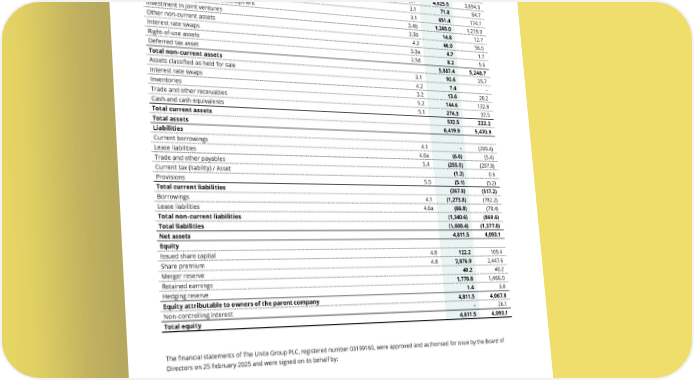 THE UNITE GROUP PLC Annual Report and Accounts 2024 154 FINANCIAL STATEMENTS CONSOLIDATED BALANCE SHEET At 31 December 2024 2024 2023 Note £m £m Assets Investment property (owned) 3.1 4,025.5 3,694.3 Investment property (leased) 3.1 71.8 84.7 Investment property under development 3.1 451.4 174.7 Investment in joint ventures 3.4b 1,265.0 1,219.0 Other non-current assets 3.3b 14.8 12.7 Interest rate swaps 4.2 46.0 56.0 Right-of-use assets 3.3a 4.7 1.7 Deferred tax asset 2.5d 8.2 5.6 Total non-current assets 5,887.4 5,248.7 Assets classified as held for sale 3.1 92.6 25.7 Interest rate swaps 4.2 7.4 - Inventories 3.2 13.6 26.2 Trade and other receivables 5.2 144.6 132.8 Cash and cash equivalents 5.1 274.3 37.5 Total current assets 532.5 222.2 Total assets 6,419.9 5,470.9 Liabilities Current borrowings 4.1 - (299.4) Lease liabilities 4.6a (6.0) (5.4) Trade and other payables 5.4 (255.5) (207.8) Current tax (liability) / Asset (1.2) 0.6 Provisions 5.5 (5.1) (5.2) Total current liabilities (267.8) (517.2) Borrowings 4.1 (1,273.8) (782.2) Lease liabilities 4.6a (66.8) (78.4) Total non-current liabilities (1,340.6) (860.6) Total liabilities (1,608.4) (1,377.8) Net assets 4,811.5 4,093.1 Equity Issued share capital 4.8 122.2 109.4 Share premium 4.8 2,876.9 2,447.6 Merger reserve 40.2 40.2 Retained earnings 1,770.8 1,466.0 Hedging reserve 1.4 3.8 Equity attributable to owners of the parent company 4,811.5 4,067.0 Non-controlling interest - 26.1 Total equity 4,811.5 4,093.1 The financial statements of The Unite Group PLC, registered number 03199160, were approved and authorised for issue by the Board of Directors on 25 February 2025 and were signed on its behalf by: Joe Lister Mike Burt Director Director