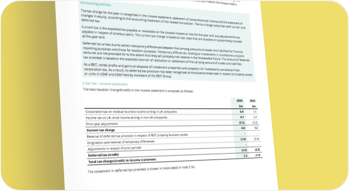 THE UNITE GROUP PLC Annual Report and Accounts 2024 169 2.5 Tax As a REIT, rental profits and gains on disposal of investment properties are exempt from corporation tax. The Group pays UK corporation tax on the profits from its residual business, including management fees received from joint ventures, together with UK income tax on rental income that arises from investments held by offshore subsidiaries in which the Group holds a non-controlling interest. Accounting policies The tax charge for the year is recognised in the income statement, statement of comprehensive income and the statement of changes in equity, according to the accounting treatment of the related transaction. The tax charge comprises both current and deferred tax. Current tax is the expected tax payable or receivable on the taxable income or loss for the year and any adjustment to tax payable in respect of previous years. The current tax charge is based on tax rates that are enacted or substantively enacted at the year-end. Deferred tax arises due to certain temporary differences between the carrying amounts of assets and liabilities for financial reporting purposes and those for taxation purposes. Temporary differences relating to investments in subsidiaries and joint ventures are not provided for to the extent that they will probably not reverse in the foreseeable future. The amount of deferred tax provided is based on the expected manner of realisation or settlement of the carrying amount of assets and liabilities. As a REIT, rental profits and gains on disposal of investment properties and property rich investments are exempt from corporation tax. As a result, no deferred tax provision has been recognised at the balance sheet date in respect of property assets or units in USAF and LSAV held by members of the REIT Group. 2.5a) Tax – income statement The total taxation charge/(credit) in the income statement is analysed as follows: 2024 2023 £m £m Corporation tax on residual business income arising in UK companies 4.9 1.0 Income tax on UK rental income arising in non-UK companies 0.1 0.4 Prior year adjustments (0.2) (0.2) Current tax charge 4.8 1.2 Reversal of deferred tax provision in respect of REIT property business assets - - Origination and reversal of temporary differences (2.6) (2.3) Adjustments in respect of prior periods - - Deferred tax (credit) (2.6) (2.3) Total tax charge/(credit) in income statement 2.2 (1.1) The movement in deferred tax provided is shown in more detail in note 2.5d.