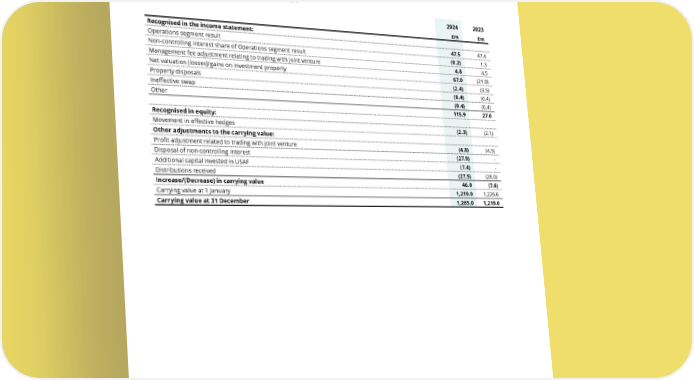 THE UNITE GROUP PLC Annual Report and Accounts 2024 184 FINANCIAL STATEMENTS 3.4b) Movement in carrying value of the Group’s investments in joint ventures The carrying value of the Group’s investment in joint ventures increased by £46.0 million during the year ended 31 December 2024 (2023: £7.6 million decrease), resulting in an overall carrying value of £1,265.0 million (2023: £1,219.0 million). The following table shows how the decrease has arisen: 2024 2023 £m £m Recognised in the income statement: Operations segment result 47.5 47.4 Non-controlling interest share of Operations segment result (0.2) 1.3 Management fee adjustment relating to trading with joint venture 4.8 4.5 Net valuation (losses)/gains on investment property 67.0 (21.9) Property disposals (2.4) (3.5) Ineffective swap (0.4) (0.4) Other (0.4) (0.4) 115.9 27.0 Recognised in equity: Movement in effective hedges (2.3) (2.1) Other adjustments to the carrying value: Profit adjustment related to trading with joint venture (4.8) (4.5) Disposal of non-controlling interest (27.9) - Additional capital invested in USAF (7.4) - Distributions received (27.5) (28.0) Increase/(Decrease) in carrying value 46.0 (7.6) Carrying value at 1 January 1,219.0 1,226.6 Carrying value at 31 December 1,265.0 1,219.0 NOTES TO THE FINANCIAL STATEMENTS continued