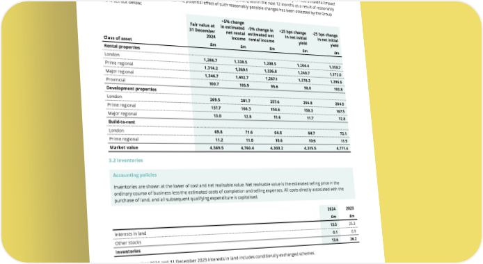 THE UNITE GROUP PLC Annual Report and Accounts 2024 178 FINANCIAL STATEMENTS NOTES TO THE FINANCIAL STATEMENTS continued Fair value sensitivity analysis A decrease in net rental income or occupancy will result in a decrease in the fair value, whereas a decrease in the discount rate (yield) will result in an increase in fair value. There are inter-relationships between these rates as they are partially determined by market conditions. These two key sources of estimation uncertainty are considered to represent those most likely to have a material impact on the valuation of the Group’s investment property (owned and development) within the next 12 months as a result of reasonably possible changes in assumptions used. The potential effect of such reasonably possible changes has been assessed by the Group and is set out below: Fair value at 31 December 2024 +5% change in estimated net rental income -5% change in estimated net rental income +25 bps change in net initial yield -25 bps change in net initial yield Class of asset £m £m £m £m £m Rental properties London 1,286.7 1,338.5 1,208.5 1,204.4 1,350.7 Prime regional 1,314.2 1,369.1 1,236.8 1,240.7 1,372.0 Major regional 1,346.7 1,402.7 1,267.1 1,278.3 1,396.6 Provincial 100.7 105.9 95.6 98.0 103.8 Development properties London 269.5 281.7 257.6 256.8 284.0 Prime regional 157.7 166.3 150.6 150.3 167.5 Major regional 13.0 12.8 11.6 11.7 12.8 Build-to-rent London 69.8 71.6 64.8 64.7 72.1 Prime regional 11.2 11.8 10.6 10.6 11.9 Market value 4,569.5 4,760.4 4,303.2 4,315.5 4,771.4 3.2 Inventories Accounting policies Inventories are shown at the lower of cost and net realisable value. Net realisable value is the estimated selling price in the ordinary course of business less the estimated costs of completion and selling expenses. All costs directly associated with the purchase of land, and all subsequent qualifying expenditure is capitalised. 2024 2023 £m £m Interests in land 13.5 25.3 Other stocks 0.1 0.9 Inventories 13.6 26.2 At 31 December 2024 and 31 December 2023 interests in land includes conditionally exchanged schemes.