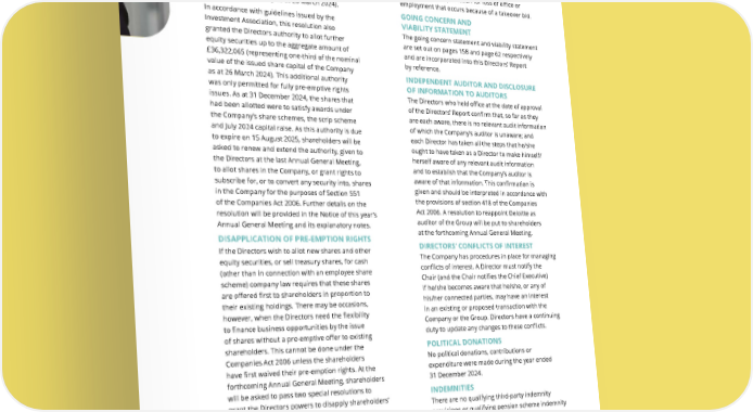 THE UNITE GROUP PLC Annual Report and Accounts 2024 139 CHRISTOPHER SZPOJNAROWICZ COMPANY SECRETARY to allot ordinary shares up to an aggregate nominal amount of £36,322,065 (which represented one- third of the nominal value of the issued share capital of the Company as at 26 March 2024). In accordance with guidelines issued by the Investment Association, this resolution also granted the Directors authority to allot further equity securities up to the aggregate amount of £36,322,065 (representing one-third of the nominal value of the issued share capital of the Company as at 26 March 2024). This additional authority was only permitted for fully pre-emptive rights issues. As at 31 December 2024, the shares that had been allotted were to satisfy awards under the Company’s share schemes, the scrip scheme and July 2024 capital raise. As this authority is due to expire on 15 August 2025, shareholders will be asked to renew and extend the authority, given to the Directors at the last Annual General Meeting, to allot shares in the Company, or grant rights to subscribe for, or to convert any security into, shares in the Company for the purposes of Section 551 of the Companies Act 2006. Further details on the resolution will be provided in the Notice of this year’s Annual General Meeting and its explanatory notes. DISAPPLICATION OF PRE-EMPTION RIGHTS If the Directors wish to allot new shares and other equity securities, or sell treasury shares, for cash (other than in connection with an employee share scheme) company law requires that these shares are offered first to shareholders in proportion to their existing holdings. There may be occasions, however, when the Directors need the flexibility to finance business opportunities by the issue of shares without a pre-emptive offer to existing shareholders. This cannot be done under the Companies Act 2006 unless the shareholders have first waived their pre-emption rights. At the forthcoming Annual General Meeting, shareholders will be asked to pass two special resolutions to grant the Directors powers to disapply shareholders’ pre-emption rights under certain circumstances. Further details on the resolutions will be provided in the Notice of this year’s Annual General Meeting. CHANGE OF CONTROL All of the Company’s share schemes contain provisions relating to a change of control. Outstanding rewards and options would normally vest and become exercisable on a change of control, subject to the satisfaction of any performance conditions. Other than certain of the Group’s banking facilities, there are no other significant agreements to which the Company is a party that affect, alter or terminate upon a change of control of the Company following a takeover bid. Nor are there any agreements between the Company and its Directors or employees providing for compensation for loss of office or employment that occurs because of a takeover bid. GOING CONCERN AND VIABILITY STATEMENT The going concern statement and viability statement are set out on pages 158 and page 62 respectively and are incorporated into this Directors’ Report by reference. INDEPENDENT AUDITOR AND DISCLOSURE OF INFORMATION TO AUDITORS The Directors who held office at the date of approval of the Directors’ Report confirm that, so far as they are each aware, there is no relevant audit information of which the Company’s auditor is unaware; and each Director has taken all the steps that he/she ought to have taken as a Director to make himself/ herself aware of any relevant audit information and to establish that the Company’s auditor is aware of that information. This confirmation is given and should be interpreted in accordance with the provisions of section 418 of the Companies Act 2006. A resolution to reappoint Deloitte as auditor of the Group will be put to shareholders at the forthcoming Annual General Meeting. DIRECTORS’ CONFLICTS OF INTEREST The Company has procedures in place for managing conflicts of interest. A Director must notify the Chair (and the Chair notifies the Chief Executive) if he/she becomes aware that he/she, or any of his/her connected parties, may have an interest in an existing or proposed transaction with the Company or the Group. Directors have a continuing duty to update any changes to these conflicts. POLITICAL DONATIONS No political donations, contributions or expenditure were made during the year ended 31 December 2024. INDEMNITIES There are no qualifying third-party indemnity provisions or qualifying pension scheme indemnity provisions for the benefit of any of the Directors. RESEARCH AND DEVELOPMENT The Company is not currently carrying on any activities in the field of research and development. BRANCHES OUTSIDE THE UK The Company does not have any branches outside of the UK.