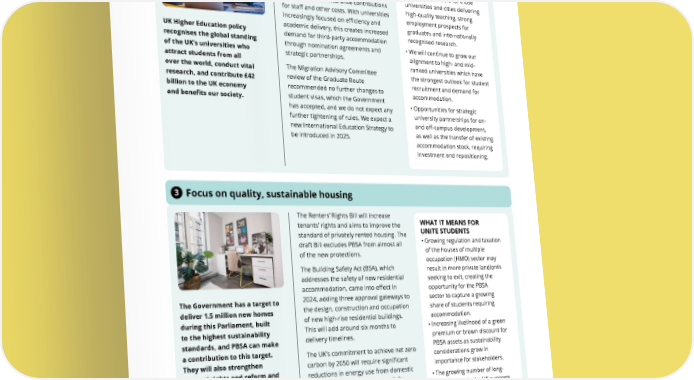 THE UNITE GROUP PLC Annual Report and Accounts 2024 07 UK Higher Education policy recognises the global standing of the UK’s universities who attract students from all over the world, conduct vital research, and contribute £42 billion to the UK economy and benefits our society. Government more supportive of Higher Education 2 WHAT IT MEANS FOR UNITE STUDENTS • Potential for stronger growth in student numbers for those universities and cities delivering high-quality teaching, strong employment prospects for graduates and internationally recognised research. • We will continue to grow our alignment to high- and mid- ranked universities which have the strongest outlook for student recruitment and demand for accommodation. • Opportunities for strategic university partnerships for on- and off-campus development, as well as the transfer of existing accommodation stock, requiring investment and repositioning. The Government has announced a 3% increase to tuition fees for the 2025/26 academic year, the first increase since 2017/18. This increase will help universities balance budgets in the face of rising national insurance contributions for staff and other costs. With universities increasingly focused on efficiency and academic delivery, this creates increased demand for third-party accommodation through nomination agreements and strategic partnerships. The Migration Advisory Committee review of the Graduate Route recommended no further changes to student visas, which the Government has accepted, and we do not expect any further tightening of rules. We expect a new International Education Strategy to be introduced in 2025. Focus on quality, sustainable housing The Renters’ Rights Bill will increase tenants’ rights and aims to improve the standard of privately rented housing. The draft Bill excludes PBSA from almost all of the new protections. The Building Safety Act (BSA), which addresses the safety of new residential accommodation, came into effect in 2024, adding three approval gateways to the design, construction and occupation of new high-rise residential buildings. This will add around six months to delivery timelines. The UK’s commitment to achieve net zero carbon by 2050 will require significant reductions in energy use from domestic properties. This includes potentially increasing Minimum Energy Efficiency Standards (MEES), requiring rental properties to achieve EPC ratings of at least B by 2030. 3 The Government has a target to deliver 1.5 million new homes during this Parliament, built to the highest sustainability standards, and PBSA can make a contribution to this target. They will also strengthen renters’ rights and reform and streamline planning regulation, with increased funding for local authorities, which could reduce the time to deliver new housing, including PBSA. WHAT IT MEANS FOR UNITE STUDENTS • Growing regulation and taxation of the houses of multiple occupation (HMO) sector may result in more private landlords seeking to exit, creating the opportunity for the PBSA sector to capture a growing share of students requiring accommodation. • Increasing likelihood of a green premium or brown discount for PBSA assets as sustainability considerations grow in importance for stakeholders. • The growing number of long- term renters in the UK supports the growth of the build-to-rent (BTR) sector. We believe there is opportunity to grow our platform by catering to the growing number of young professionals living in major UK cities.