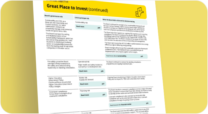 THE UNITE GROUP PLC Annual Report and Accounts 2024 96 BOARD ACTIVITIES continued GOVERNANCE STRATEGIC OBJECTIVE Great Place to Invest (continued) Board’s governance role Link to principal risk What the Board did in 2024 and its decision-making Sustainability and ESG: as a listed plc and responsible and trusted business, our wider stakeholders demand we proactively manage environmental, social and governance risks. The Board oversees the setting and implementation of our sustainability framework, which has the overarching ambition for Unite Students to clearly lead the living sector on sustainability issues and be in the leading pack of real estate companies in the wider sector. Sustainability risk Read more p60 The Board continued its oversight of our sustainability framework and Net Zero Carbon Pathway, built on science-based targets validated by the SBTi, to achieve our objective of becoming net zero carbon across both the Company’s operations and development activities by 2030. The Board also interrogated our ongoing ESG regulatory and reporting compliance.The Board considered the specific climate change risks, identifying them across: Regulatory risk; Physical risk; Transition risk; and Stakeholder risk. The Board considered the impact of these risks and oversees the assurance of the corresponding risk management. The Board were supportive of £10.2 million capital investment into energy efficiency projects delivering energy savings. Board oversight of the Group’s first sustainable construction framework published in 2023. This framework had a successful first year of implementation and progress against carbon targets. Read more about sustainability p43 Fire safety: proactive Board oversight of improvements in fire safety and demonstrating leadership on cladding remediation. Operational risk Major health and safety incident in a property or a development site Read more p58 The Board continued to oversee the cladding remediation programme and ongoing investment plan. Higher Education Government Policy: Continued focus on potential Higher Education Government Policy changes. Market risk Supply and demand Read more p57 Ongoing Board monitoring of Higher Education Government Policy and its impact for PBSA and universities more widely. Covenants’ compliance: Group Board oversight of our covenants’ compliance. Financing risk Read more p61 The Board monitors covenants’ compliance across a range of income/ stress scenarios to ensure that if any risks emerge, the Board is ready to identify further action and work with lenders well in advance. Covenant compliance is also overseen by the Audit & Risk Committee and by the external audit review of our covenant compliance through the going concern process. Read more in the Financial review p35 Capital structure: Group Board focus on a strong and flexible capital structure, which can adapt to market conditions, and reducing and diversifying the cost of funding. Financing risk Read more p61 The Board approved the £450 million capital raise in July 2024 which received strong investor support. The proceeds will be used to support our joint venture with Newcastle University, acquisition of new assets in USAF and our committed pipeline and increased investment into our existing estate through asset management projects to enhance future returns. During the year, the Board supported the establishment of a £2 billion Euro Medium Term Note (EMTN) debt issuance programme in addition to a new eight year £400 million bond issue under the new EMTN programme. We also harmonised the existing 2029 Liberty Living Finance plc bonds with the EMTN programme and substituted Unite Group plc as the issuer of this bond, in place of Liberty Living Finance plc. Read more in the Financial review p35
