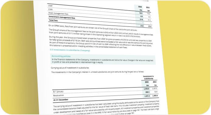 THE UNITE GROUP PLC Annual Report and Accounts 2024 185 3.4c) Transactions with joint ventures The Group acts as asset and property manager for the joint ventures and receives management fees in relation to these services. In addition, the Group is entitled to performance fees from USAF and LSAV if the joint ventures outperform certain benchmarks. No performance fees were recognised in the year (2023: £nil). 2024 2023 £m £m USAF 16.9 16.6 LSAV 4.9 4.8 Asset management fees 21.8 21.4 Investment management fees - - Total fees 21.8 21.4 On an EPRA basis, fees from joint ventures are shown net of the Group’s share of the cost to the joint ventures. The Group’s share of the management fees to the joint ventures is £4.6 million (2023: £4.5 million), which results in management fees from joint ventures of £17.3 million being shown in the Operating segment result in note 2.2a (2023: £16.9 million). During the year, the Group purchased seven properties from USAF for gross proceeds of £235.5m and sold two properties to USAF for total gross proceeds of £118.5m. Both sale and purchase were transacted at fair value which was the same as the carrying value. As part of these transactions, the Group paid £117.0m of cash to USAF reflecting the net difference in value between these assets, this balance is presented within investing activities in the consolidated statement of cash flows. 3.5 Investments in subsidiaries (Company) Accounting policies In the financial statements of the Company, investments in subsidiaries are held at fair value. Changes in fair value are recognised in profit or loss and presented in retained earnings in equity. Carrying value of investment in subsidiaries The movements in the Company’s interest in unlisted subsidiaries and joint ventures during the year are as follows: Investment in subsidiaries 2024 2023 £m £m At 1 January 2,450.8 2,397.0 Revaluation 200.5 53.8 At 31 December 2,651.3 2,450.8 The carrying value of investment in subsidiaries has been calculated using the equity attributable to the owners of the Company from the consolidated balance sheet adjusted for the fair value of fixed rate loans. This includes investment property, investment property under development and swaps at a fair value calculated by a third-party expert. All investment properties and investment properties under development are classified as Level 3 in the IFRS 13 fair value hierarchy are discussed on page 187. The fixed rate loans range between Level 1 and Level 2 in the IFRS 13 fair value hierarchy are discussed further on page 187. Significant assumptions underlying the valuation of investment in subsidiaries are valuation of investment property and investment property under development, together with the value of borrowings and inter-company debt. A full list of the Company’s subsidiaries and joint ventures can be found in note 9.