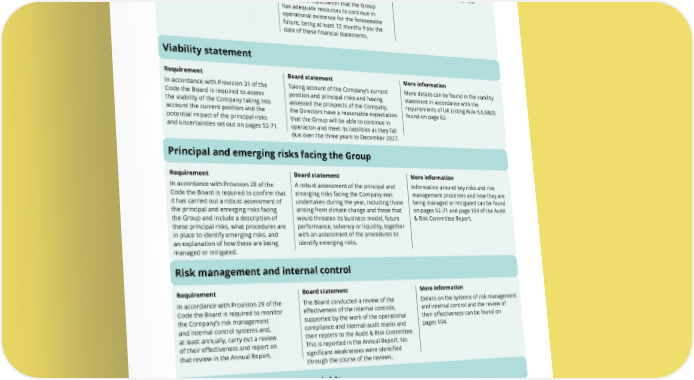 THE UNITE GROUP PLC Annual Report and Accounts 2024 81 Requirement In accordance with Provision 30 of the Code, the Board is required to confirm that the Group has adequate resources to continue in operation for the foreseeable future. Board statement After making enquiries and having considered forecasts and appropriate sensitivities, the Directors have formed a judgement, at the time of approving the financial statements, that there is a reasonable expectation that the Group has adequate resources to continue in operational existence for the foreseeable future, being at least 12 months from the date of these financial statements. More information More details on the going concern statement, in accordance with the requirements of UK Listing Rule 6.6.6R(3), can be found on pages 158 and 159. Going concern Requirement In accordance with Provision 31 of the Code the Board is required to assess the viability of the Company taking into account the current position and the potential impact of the principal risks and uncertainties set out on pages 52-71. Board statement Taking account of the Company’s current position and principal risks and having assessed the prospects of the Company, the Directors have a reasonable expectation that the Group will be able to continue in operation and meet its liabilities as they fall due over the three years to December 2027. More information More details can be found in the viability statement in accordance with the requirements of UK Listing Rule 6.6.6R(3) found on page 62. Viability statement Requirement In accordance with Provision 28 of the Code the Board is required to confirm that it has carried out a robust assessment of the principal and emerging risks facing the Group and include a description of these principal risks, what procedures are in place to identify emerging risks, and an explanation of how these are being managed or mitigated. Board statement A robust assessment of the principal and emerging risks facing the Company was undertaken during the year, including those arising from climate change and those that would threaten its business model, future performance, solvency or liquidity, together with an assessment of the procedures to identify emerging risks. More information Information around key risks and risk management processes and how they are being managed or mitigated can be found on pages 52-71 and page 104 of the Audit & Risk Committee Report. Principal and emerging risks facing the Group Requirement In accordance with Provision 29 of the Code the Board is required to monitor the Company’s risk management and internal control systems and, at least annually, carry out a review of their effectiveness and report on that review in the Annual Report. Board statement The Board conducted a review of the effectiveness of the internal controls, supported by the work of the operational compliance and internal audit teams and their reports to the Audit & Risk Committee. This is reported in the Annual Report. No significant weaknesses were identified through the course of the reviews. More information Details on the systems of risk management and internal control and the review of their effectiveness can be found on pages 104. Risk management and internal control Requirement In accordance with Provision 27 of the Code the Board should confirm that it considers the Annual Report, taken as a whole, is fair, balanced and understandable and provides the information necessary for shareholders to assess the Company’s position and performance, business model and strategy. Board statement The Directors consider that the Annual Report, taken as a whole, is fair, balanced and understandable and provides the information necessary for shareholders to assess the Company’s position and performance, business model and strategy. More information See the Audit & Risk Committee Report on pages 101-105. Fair, balanced and understandable