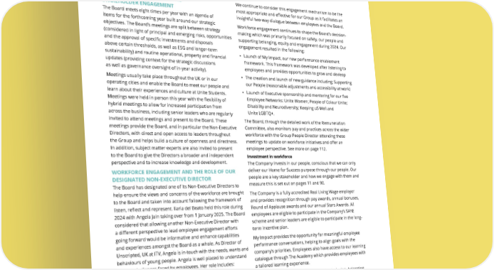 THE UNITE GROUP PLC Annual Report and Accounts 2024 86 GOVERNANCE BOARD LEADERSHIP AND PURPOSE continued GOVERNANCE HOW THE BOARD OPERATES AND STAKEHOLDER ENGAGEMENT The Board meets eight times per year with an agenda of items for the forthcoming year built around our strategic objectives. The Board’s meetings are split between strategy (considered in light of principal and emerging risks, opportunities and the approval of specific investments and disposals above certain thresholds, as well as ESG and longer-term sustainability) and routine operational, property and financial updates (providing context for the strategic discussions as well as governance oversight of in-year activity). Meetings usually take place throughout the UK or in our operating cities and enable the Board to meet our people and learn about their experiences and culture at Unite Students. Meetings were held in person this year with the flexibility of hybrid meetings to allow for increased participation from across the business, including senior leaders who are regularly invited to attend meetings and present to the Board. These meetings provide the Board, and in particular the Non-Executive Directors, with direct and open access to leaders throughout the Group and helps build a culture of openness and directness. In addition, subject matter experts are also invited to present to the Board to give the Directors a broader and independent perspective and to increase knowledge and development. WORKFORCE ENGAGEMENT AND THE ROLE OF OUR DESIGNATED NON-EXECUTIVE DIRECTOR The Board has designated one of its Non-Executive Directors to help ensure the views and concerns of the workforce are brought to the Board and taken into account following the framework of listen, reflect and represent. Ilaria del Beato held this role during 2024 with Angela Jain taking over from 1 January 2025. The Board considered that allowing another Non-Executive Director with a different perspective to lead employee engagement efforts going forward would be informative and enhance capabilities and experiences amongst the Board as a whole. As Director of Unscripted, UK at ITV, Angela is in-touch with the needs, wants and behaviours of young people. Angela is well placed to understand current challenges faced by employees. Her role includes: • attending the Culture Matters forum to understand concerns and share these with the Board, so appropriate steps are taken to evaluate the impact on the workforce of proposals and developments • monitoring employee engagement surveys and actions • soliciting employee views on remuneration structures and processes • collaborating with our Group People Director, the Head of People Development & Experience, the Belonging, Equity and Engagement team and the wider People team. We continue to consider this engagement mechanism to be the most appropriate and effective for our Group as it facilitates an insightful two-way dialogue between employees and the Board. Workforce engagement continues to shape the Board’s decision- making which was primarily focused on safety, our people and supporting belonging, equity and engagement during 2024. Our engagement resulted in the following: • Launch of My Impact, our new performance enablement framework. This framework was developed after listening to employees and provides opportunities to grow and devleop • The creation and launch of new guidance including; Supporting our People (reasonable adjustments and accessibility at work) • Launch of Executive sponsorship and mentoring for our five Employee Networks: Unite Women; People of Colour Unite; Disability and Neurodiversity; Keeping uS Well and Unite LGBTQ+. The Board, through the detailed work of the Remuneration Committee, also monitors pay and practices across the wider workforce with the Group People Director attending these meetings to update on workforce initiatives and offer an employee perspective. See more on page 112. Investment in workforce The Company invests in our people, conscious that we can only deliver our Home for Success purpose through our people. Our people are a key stakeholder and how we engage with them and measure this is set out on pages 11 and 90. The Company is a fully accredited Real Living Wage employer and provides recognition through pay awards, annual bonuses, Round of Applause awards and our annual Stars Awards. All employees are eligible to participate in the Company’s SAYE scheme and senior leaders are eligible to participate in the long- term incentive plan. My Impact provides the opportunity for meaningful employee performance conversations, helping to align goals with the company’s priorities. Employees also have access to our learning catalogue through The Academy which provides employees with a tailored learning experience. The Board also considers diversity, equity, inclusion, belonging and wellbeing across the workforce, by considering our gender and ethnic diversity throughout the Group as well as our gender pay gap. How we engage with our investors The Board values effective communication with shareholders and other providers of capital to the business and welcomes their views on the Group’s approach to corporate governance. The Board creates sustainable value for our three types of investors: institutional, retail and debt.
