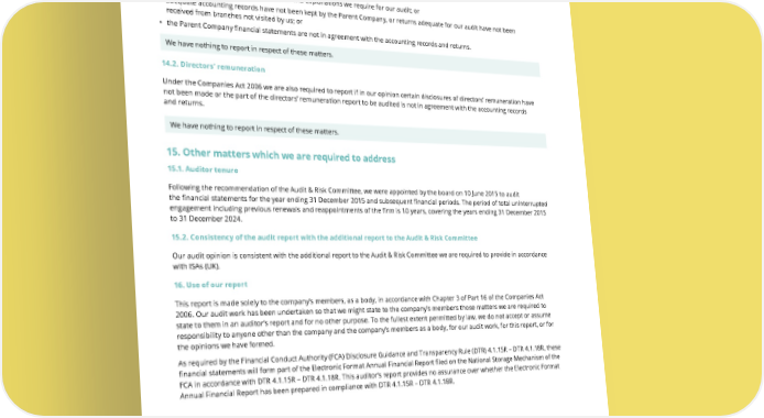 THE UNITE GROUP PLC Annual Report and Accounts 2024 152 FINANCIAL STATEMENTS INDEPENDENT AUDITOR’S REPORT continued 14. Matters on which we are required to report by exception 14.1. Adequacy of explanations received and accounting records Under the Companies Act 2006 we are required to report to you if, in our opinion: • we have not received all the information and explanations we require for our audit; or • adequate accounting records have not been kept by the Parent Company, or returns adequate for our audit have not been received from branches not visited by us; or • the Parent Company financial statements are not in agreement with the accounting records and returns. We have nothing to report in respect of these matters. 14.2. Directors’ remuneration Under the Companies Act 2006 we are also required to report if in our opinion certain disclosures of directors’ remuneration have not been made or the part of the directors’ remuneration report to be audited is not in agreement with the accounting records and returns. We have nothing to report in respect of these matters. 15. Other matters which we are required to address 15.1. Auditor tenure Following the recommendation of the Audit & Risk Committee, we were appointed by the board on 10 June 2015 to audit the financial statements for the year ending 31 December 2015 and subsequent financial periods. The period of total uninterrupted engagement including previous renewals and reappointments of the firm is 10 years, covering the years ending 31 December 2015 to 31 December 2024. 15.2. Consistency of the audit report with the additional report to the Audit & Risk Committee Our audit opinion is consistent with the additional report to the Audit & Risk Committee we are required to provide in accordance with ISAs (UK). 16. Use of our report This report is made solely to the company’s members, as a body, in accordance with Chapter 3 of Part 16 of the Companies Act 2006. Our audit work has been undertaken so that we might state to the company’s members those matters we are required to state to them in an auditor’s report and for no other purpose. To the fullest extent permitted by law, we do not accept or assume responsibility to anyone other than the company and the company’s members as a body, for our audit work, for this report, or for the opinions we have formed. As required by the Financial Conduct Authority (FCA) Disclosure Guidance and Transparency Rule (DTR) 4.1.15R – DTR 4.1.18R, these financial statements will form part of the Electronic Format Annual Financial Report filed on the National Storage Mechanism of the FCA in accordance with DTR 4.1.15R – DTR 4.1.18R. This auditor’s report provides no assurance over whether the Electronic Format Annual Financial Report has been prepared in compliance with DTR 4.1.15R – DTR 4.1.18R. Stephen Craig FCA (Senior statutory auditor) For and on behalf of Deloitte LLP Statutory Auditor London, United Kingdom 25 February 2025