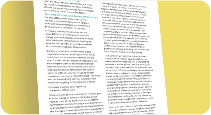 THE UNITE GROUP PLC Annual Report and Accounts 2024 114 REMUNERATION COMMITTEE continued GOVERNANCE This change reflects the Committee’s view that bonus deferral is a means of aligning the interests of shareholders and Executives over the medium term, by facilitating the building up of a shareholding over time. However, where an Executive has acquired (through self-purchases) or earned (through share-based incentives) a significant total holding of shares – as defined by the in-post shareholding guidelines – the Committee considers it appropriate to relax the mandatory deferral requirement and allow any bonus subsequently earned to be paid entirely in cash. This represents a more competitive, and fairer approach, without diluting our clear emphasis on the importance of the alignment of Executive and shareholder interests through meaningful share ownership. The existing requirement to defer up to 50% of any amount earned for two years remains in place as an Executive Director is building towards their in-post shareholding guideline, and we have maintained rigorous and enforceable malus and clawback provisions for all variable pay. The majority of responses received on this change were supportive. One shareholder responded that the change did not align with its voting policy, while another asked the Committee to consider reducing, rather than removing, the mandatory deferral requirement (but with an exception made for the current CEO noting his already significant shareholding). The Committee re-evaluated its original proposal based on the comments received, before concluding to submit this for approval without further revision noting: (a) the balance of shareholder feedback received was supportive, and (b) other aspects of the Policy and its implementation continue to underpin strong alignment of Executive interests with those of shareholders. However, recognising that circumstances can change, and acknowledging that this is an evolving area of market practice, the Committee will keep under review the deferral mechanism at the next Policy review, to ensure it continues to remain appropriate for Unite Group. As part of the consultation, one shareholder requested further information on how the proposed changes would position the CEO relative to sector peers, which is summarised below as further context for all shareholders. This analysis illustrates that, while Unite Group is currently ranked third out of 17 companies in the sector in market cap terms, the CEO’s salary is tenth highest and total remuneration is 12th highest. The cash elements of the CEO’s remuneration (i.e. salary, pension and cash bonus) currently make up 52% of the total fair value of his package, ranking tenth of sector comparators (and 12th in monetary terms). With the CEO significantly exceeding his shareholding guidelines, the proposed changes to the bonus deferral mechanism would mean that the cash elements of remuneration would rise to 65% of his total pay from 2025. OVERALL PAY OUTCOMES FOR 2024 Taken as a whole, the Committee is satisfied that overall pay outcomes in respect of the year ended 31 December 2024 are appropriate and accordingly we have not applied any discretion to this year’s incentive outcomes. REVIEW OF THE DIRECTORS’ REMUNERATION POLICY The 2025 AGM marks the third anniversary of the adoption of the Directors’ Remuneration Policy and in line with UK reporting regulations, a new Policy is being submitted to shareholders for approval. In reviewing the Policy, the Committee took into account Unite Group’s historical performance and strategy, and market practice across the UK real estate sector and broader FTSE market since the Policy was approved. The Committee also considered the views of Unite Group’s broad range of stakeholders. Overall, the Committee is satisfied that the existing remuneration structure – consisting of salaries, pension contributions and performance-linked short- and long- term incentives – remains appropriate. We proposed two main changes to the Policy and wrote to shareholders representing c.67% of the issued share capital, as well as to key proxy advisers, for comments and feedback at the end of 2024. In total, we received replies from shareholders representing c.45% of the issued share capital, with this feedback having been fully considered by the Committee in agreeing the final proposals, as follows: (1) Increase the annual bonus opportunity from 140% to 150% of salary. This change seeks to ensure that the Policy remains aligned to market practice for a company of Unite Group’s size operating in the UK real estate sector, and provides the Committee with additional flexibility to incentivise the senior leadership team to deliver exceptional performance over the next three years. Unite Group’s annual bonus opportunity has been changed only twice over the last 20 years: an increase from 100% to 144% of salary in 2008, and a subsequent reduction from 144% to 140% of salary in 2019 (as part of a simplification of the scheme). A maximum opportunity of 150% of salary would be aligned with 12 out of 16 other FTSE 350 Real Estate sector peers and would continue to be weighted at least 70% on financial performance. Shareholder feedback on this change was generally very supportive and accordingly no changes were made to the original proposal. (2) Disapply the bonus deferral requirement in cases where an Executive Director meets or exceeds their in-post shareholding guideline.