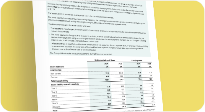 THE UNITE GROUP PLC Annual Report and Accounts 2024 193 4.6 Leases 4.6a) Lease liabilities Accounting policies The Group assesses whether a contract is or contains a lease, at inception of the contract. The Group recognises a right-of-use asset (see note 3.1a) and a corresponding lease liability with respect to all lease arrangements in which it is the lessee. The lease liability is initially measured at the present value of the lease payments that are not paid at the commencement date, discounted by using the Group’s incremental borrowing rate (since the rate implicit in the leases cannot be readily determined) of 4.17%. The lease liability is presented as a separate line in the consolidated balance sheet. The lease liability is subsequently measured by increasing the carrying amount to reflect interest on the lease liability (using the effective interest method) and by reducing the carrying amount to reflect the lease payments made. The Group remeasures the lease liability whenever: • The lease term has changed, in which case the lease liability is remeasured by discounting the revised lease payments using a revised discount rate • The lease payments change due to changes in an index, in which cases the lease liability is remeasured by discounting the revised lease payments using an unchanged discount rate (unless the lease payments change is due to a change in a floating interest rate, in which case a revised discount rate is used) • A lease contract is modified and the lease modification is not accounted for as a separate lease, in which case the lease liability is remeasured based on the lease term of the modified lease by discounting the revised lease payments using a revised discount rate at the effective date of the modification. The Group did not make any such adjustments during the period presented. Undiscounted cash flows Carrying value 2024 2023 2024 2023 Lease liabilities £m £m £m £m Analysed as: Non-current 97.3 121.3 66.8 78.4 Current 11.8 13.6 6.0 5.4 Total lease liability 109.1 134.9 72.8 83.8 Lease liability maturity analysis Year 1 11.8 13.6 6.0 5.4 Year 2 12.2 13.5 6.6 7.4 Year 3 12.0 13.7 6.9 7.9 Year 4 12.2 13.5 7.7 8.8 Year 5 12.1 13.8 8.1 8.8 Onwards 48.8 66.8 37.5 45.5 Total 109.1 134.9 72.8 83.8 The Group does not face a significant liquidity risk with regard to its lease liabilities. Lease liabilities are monitored within the Group’s treasury function.