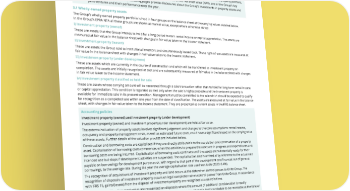 THE UNITE GROUP PLC Annual Report and Accounts 2024 172 FINANCIAL STATEMENTS Section 3: Asset management The Group holds its property portfolio directly and through its joint ventures. The performance of the property portfolio, whether wholly-owned or in joint ventures, is the key factor that drives net asset value (NAV), one of the Group’s key performance indicators. The following pages provide disclosures about the Group’s investments in property assets and joint ventures and their performance over the year. 3.1 Wholly-owned property assets The Group’s wholly-owned property portfolio is held in four groups on the balance sheet at the carrying values detailed below. In the Group’s EPRA NTA all these groups are shown at market value, except where otherwise stated. i) Investment property (owned) These are assets that the Group intends to hold for a long period to earn rental income or capital appreciation. The assets are measured at fair value in the balance sheet with changes in fair value taken to the income statement. ii) Investment property (leased) These are assets the Group sold to institutional investors and simultaneously leased back. These right-of-use assets are measured at fair value in the balance sheet with changes in fair value taken to the income statement. iii) Investment property (under development) These are assets which are currently in the course of construction and which will be transferred to Investment property on completion. The assets are initially recognised at cost and are subsequently measured at fair value in the balance sheet with changes in fair value taken to the income statement. iv) Investment property classified as held for sale These are assets whose carrying amount will be recovered through a sale transaction rather than to hold for long-term rental income or capital appreciation. This condition is regarded as met only when the sale is highly probable and the investment property is available for immediate sale in its present condition. Management must be committed to the sale which should be expected to qualify for recognition as a completed sale within one year from the date of classification. The assets are measured at fair value in the balance sheet, with changes in fair value taken to the income statement. They are presented as current assets in the IFRS balance sheet. Accounting policies Investment property (owned) and investment property (under development) Investment property (owned) and investment property (under development) are held at fair value. The external valuation of property assets involves significant judgement and changes to the core assumptions: rental income, occupancy and property management costs, as well as estimated future costs, could have a significant impact on the carrying value of these assets. Further details of the valuation process are included below. Construction and borrowing costs are capitalised if they are directly attributable to the acquisition and construction of a property asset. Capitalisation of borrowing costs commences when the activities to prepare the asset are in progress and expenditures and borrowing costs are being incurred. Capitalisation of borrowing costs continues until the assets are substantially ready for their intended use but stops if development activities are suspended. The capitalisation rate is arrived at by reference to the actual rate payable on borrowings for development purposes or, with regard to that part of the development cost financed out of general borrowings, to the average rate. During the year the average capitalisation rate used was 6.4% (2023: 6.4%). The recognition of acquisitions of investment property and land occurs at the date when control passes to Unite Group. The recognition of disposals of investment property occurs on legal completion when control passes from Unite Group. In accordance with IFRS 15, gains/(losses) from the disposal of investment property are recognised at a point in time. Contingent consideration receivables are recognised on disposals where the amount of additional consideration is readily identifiable. It is recognised at the constrained value determined by the amount that is highly probable to be receivable at the time of the disposal, and any subsequent change in value is recognised in profit or loss in the later period. The fair value of development properties is determined using a residual method, valuing each property at an estimate of what its fair value would be completed, less the estimated total costs to complete (inclusive of a profit for the developer. Investment property (leased) The Group holds certain investment property under historical sale and leaseback arrangements, acting as an intermediate lessor and subleasing its right-of-use assets. For each leased property, the Group assesses whether a contract is or contains a lease, at inception of the contract. The Group recognises a right-of-use asset and a corresponding lease liability (see note 4.6a) with respect to all lease arrangements in which it is the lessee. The right-of-use assets are initially measured at cost in accordance with IFRS 16 and subsequently at fair value in the balance sheet with changes in fair value taken to the income statement in accordance with IAS 40. NOTES TO THE FINANCIAL STATEMENTS continued