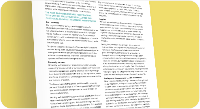 THE UNITE GROUP PLC Annual Report and Accounts 2024 91 During 2024, the Board supported the ‘Enhanced Scrip Dividend alternative’, approved by sharehlders at the 2024 Annual General Meeting. The enhanced scrip dividend was offered to all shareholders and encouraged greater participation in the scrip scheme, while retaining additinal capital in the business. THE NEED TO FOSTER BUSINESS RELATIONSHIPS WITH OUR KEY STAKEHOLDERS INCLUDING OUR CUSTOMERS, UNIVERSITY PARTNERS AND SUPPLIERS Our customers Our regular customer surveys provide opportunities for students to provide direct and independent feedback so that we can understand what is important to them and also on wider topics. The Board reviews the Net Promoter Score from our student surveys which help the Board decide where to invest in our customer offer to ensure we deliver value-for-money and a Great Place to Live. The Board supported the launch of the new MyUnite app and website during 2024, a customer-focused initiative designed to foster good relationships with incoming students and further enhance customer service. The Board also received regular updates and feedback following the roll-out. University partners University partners are key strategic stakeholders, directly accounting for around half of our reservations each year under nomination agreements and the other half indirectly through their students who book directly with us. The reputation, health and future growth of our university partners remains central to our business prospects. The Group supports the growth ambitions of its university partners through a range of different approaches from single- year accommodation arrangements to more strategic on- campus relationships. Our Higher Education Engagement team and Student Support team meet regularly with university leaders and teams at various levels, enabling us to discuss this strategic planning as well as day-to-day operational requirements. This feedback is shared with our Board who in turn consider our strategies for delivering value to universities. Through collaborative relationships with Higher Education providers, our student support team provides the Board with insight into trends and specific themes relating to student wellbeing across the Higher Education sector. Our annual Higher Education engagement survey provides the Board with key insight into our reputation and performance with our university partners as further detailed as part of our Higher Education trust operational KPI on page 17. This helps inform the way we improve our product and service. The Board is also regularly updated on trends in the Higher Education sector in the UK and globally, which inform the Group’s strategy around the universities with which it seeks to partner over the long term. Suppliers We work with a wide range of suppliers across our operations and development activities to deliver a high-quality, affordable customer offer. Our teams maintain strong relationships with suppliers and ensure that the contractors we use have the right skill set and accreditations to undertake the work in our buildings. The Board recognises the importance of supplier relationships and is provided with regular updates throughout the year. During 2024, the Board had oversight of the continued implementation and progress of our Sustainable Procurement framework. This framework includes our sustainable procurement policy, setting standards for suppliers to have policies in place regarding the minimum legal age of employment and compliance with local laws regarding working hours and overtime. During 2024, the Board were supportive of our approach to introduce a mandatory requirement for all suppliers to adhere to our Supplier Code of Conduct and enhance our modern slavery requirements, including enhanced vetting for higher risk categories of supply. You can read more about our sustainable procurement framework on page 92. Our impact on the community and the environment We are passionate about making a positive and lasting impact on our neighbours, society and the planet. To maximise the value we create for communities and ensure our ability to continue to operate and grow within them, we seek to play an active role in local communities and build trusted, long- term relationships with community partners. We are always working for the long term and we are proud to contribute to local housing needs. This can be seen in the Board’s continued support for our development activity where we actively engage with local communities to ensure the design of our buildings, public spaces and community facilities also meets their needs. During 2024 the Board and Sustainability Committee received regular updates on our Positive Impact programme which encourages our people and teams to work with local stakeholders on community impact initiatives. Through engagement with local communities, the programme has helped our people better understand sustainability and social responsibility. As a Great Place to Live, Work and Invest, we