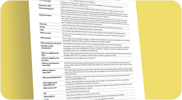 THE UNITE GROUP PLC Annual Report and Accounts 2024 216 OTHER INFORMATION Adjusted earnings An alternative performance measure based on EPRA earnings, adjusted to remove the impact of abortive acquisition costs, software as a service cost net of deferred tax and other items of an exceptional nature. The items have been excluded from adjusted earnings to improve the comparability of results year-on-year. Adjusted earnings per share/EPS The earnings per share based on adjusted earnings and weighted average number of shares in issue (basic). Adjusted EPS yield Adjusted EPS as a percentage of opening EPRA NTA (diluted). Adjusted net debt Net debt per the balance sheet, adjusted to remove IFRS 16 lease liabilities and the unamortised fair value of debt recognised on the acquisition of Liberty Living. Basis points (BPS) A basis point is a term used to describe a small percentage, usually in the context of change, and equates to 0.01%. Diluted earnings/EPS Where earnings values per share are used, basic measures divide the earnings by the weighted average number of issued shares in issue throughout the period, whilst the diluted measure also takes into account the effect of share options which have been granted and which are expected to be converted into shares in the future. Diluted NTA/NAV Where NTA/NAV per share is used, basic measures divide the NTA/NAV by the number of shares issued at the reporting date, whilst the diluted measure also takes into account the effect of share options which have been granted and which are expected to be converted into shares in the future (both for the additional number of shares that will be issued and the value of additional consideration that will be received in issuing them). Direct-let Properties where short-hold tenancy agreements are made directly between Unite Students and the student. EBITDA The Group’s adjusted EBIT, adding back depreciation and amortisation. EPRA The European Public Real Estate Association, who produce best practice recommendations for financial reporting. EPRA cost ratio The ratio of property operating expenses, overheads and management fees, against rental income, calculated on an EPRA basis. EPRA earnings EPRA earnings exclude movements relating to changes in values of investment properties, profits/losses from the disposal of properties, swap/debt break costs, interest rate swaps and the related tax effects. EPRA earnings per share/EPS The earnings per share based on EPRA earnings and weighted average number of shares in issue (basic). EPRA like-for-like rental growth The growth in rental income measured by reference to the part of the portfolio of the Group that has been consistently in operation, and not under development nor subject to acquisition or disposal, and which accordingly enables more meaningful comparison in underlying rental income levels. EPRA net tangible assets (NTA) EPRA NTA includes all property at market value but excludes the mark to market of financial instruments, deferred tax and intangible assets. EPRA NTA provides a consistent measure of NAV on a going concern basis. EPRA net tangible assets per share The diluted NTA per share figure based on EPRA NTA. EPRA net reinstatement value (NRV) EPRA NRV includes all property at market value but excludes the mark to market of financial instruments, deferred tax and real estate transfer tax. EPRA NRV assumes that entities never sell assets and represents the value required to rebuild the entity. EPRA net disposal value (NDV) EPRA NDV includes all property at market value, excludes the mark to market of financial instruments but includes the fair value of fixed interest rate debt and the carrying value of intangible assets. EPRA NDV represents the shareholders’ value in a disposal scenario. EPRA net initial yield (NIY) Annualised NOI generated by the Group’s rental properties expressed as a percentage of their fair value, taking into account notional acquisition costs. EPRA topped up net initial yield (NIY) EPRA Net Initial Yield adjusted to include the effect of the expiration of rent free periods (or other unexpired lease incentives such as discounted rent periods or step rents). EPRA vacancy rate The ratio of the estimated market rental value of vacant spaces against the estimated market rental value of the entire property portfolio (including vacant spaces). ESG Environmental, Social and Governance. Full occupancy Full occupancy is defined as occupancy in excess of 97%. GRESB GRESB is a benchmark of the Environmental, Social and Governance (ESG) performance of real assets. Gross asset value (GAV) The fair value of rental properties, leased properties and development properties. The Group Wholly-owned balances plus Unite Group’s interests relating to USAF and LSAV. Group debt Wholly-owned borrowings plus Unite Group’s share of borrowings attributable to USAF and LSAV. HMO Houses in multiple occupation, where buildings or flats are shared by multiple tenants who rent their own rooms and the property’s communal spaces on an individual basis. IFRS NAV per share IFRS equity attributable to the owners of the Parent Company from the consolidated balance sheet divided by the total number of shares of the Parent Company in issue at the reporting date. GLOSSARY