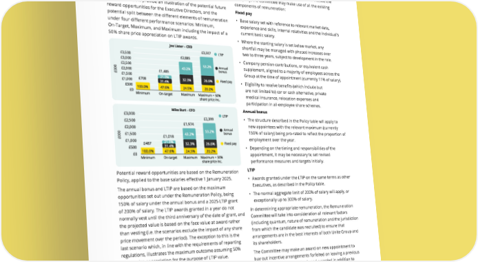 THE UNITE GROUP PLC Annual Report and Accounts 2024 125 The malus and clawback provisions may be invoked for a period of two years following payment or vesting, a timeframe which reflects the period over which the Company’s processes and systems are likely to uncover any of these trigger events. Where the Remuneration Committee determines that malus and/ or clawback will apply, the Remuneration Committee has full discretion to determine the basis of application and the means by which the provisions will be implemented. PAY FOR PERFORMANCE SCENARIOS The charts below provide an illustration of the potential future reward opportunities for the Executive Directors, and the potential split between the different elements of remuneration under four different performance scenarios: Minimum, On-Target, Maximum, and Maximum including the impact of a 50% share price appreciation on LTIP awards. Potential reward opportunities are based on the Remuneration Policy, applied to the base salaries effective 1 January 2025. The annual bonus and LTIP are based on the maximum opportunities set out under the Remuneration Policy, being 150% of salary under the annual bonus and a 2025 LTIP grant of 200% of salary. The LTIP awards granted in a year do not normally vest until the third anniversary of the date of grant, and the projected value is based on the face value at award rather than vesting (i.e. the scenarios exclude the impact of any share price movement over the period). The exception to this is the last scenario which, in line with the requirements of reporting regulations, illustrates the maximum outcome assuming 50% share price appreciation for the purpose of LTIP value. The Minimum scenario reflects base salary, pension and benefits (i.e. fixed remuneration) which are the only elements of the Executive’s remuneration packages not linked to performance. The On-Target scenario reflects fixed remuneration as above, plus bonus payout of 75% of salary and LTIP threshold vesting at 25% of maximum award (50% of salary). The Maximum scenario is shown on two bases: excluding and including the impact of share price appreciation on the value of LTIP outcomes. In both cases, the scenario includes fixed remuneration and full payout of all incentives (150% of salary under the annual bonus and 200% of salary under the LTIP), with the final scenario also including the impact of a 50% increase in Unite Group’s share price on the value of the LTIP (in effect valuing this element of pay at 300% of salary). APPROACH TO RECRUITMENT REMUNERATION External appointment to the Board When appointing a new Executive Director from outside the Company, the Committee may make use of all the existing components of remuneration: Fixed pay • Base salary set with reference to relevant market data, experience and skills, internal relativities and the individual’s current basic salary. • Where the starting salary is set below market, any shortfall may be managed with phased increases over two to three years, subject to development in the role. • Company pension contributions, or equivalent cash supplement, aligned to a majority of employees across the Group at the time of appointment (currently 11% of salary). • Eligibility to receive benefits (which include but are not limited to) car or cash alternative, private medical insurance, relocation expenses and participation in all-employee share schemes. Annual bonus • The structure described in the Policy table will apply to new appointees with the relevant maximum (currently 150% of salary) being pro-rated to reflect the proportion of employment over the year. • Depending on the timing and responsibilities of the appointment, it may be necessary to set revised performance measures and targets initially. LTIP • Awards granted under the LTIP on the same terms as other Executives, as described in the Policy table. • The normal aggregate limit of 200% of salary will apply, or exceptionally up to 300% of salary. In determining appropriate remuneration, the Remuneration Committee will take into consideration all relevant factors (including quantum, nature of remuneration and the jurisdiction from which the candidate was recruited) to ensure that arrangements are in the best interests of both Unite Group and its shareholders. The Committee may make an award on new appointment to buy out incentive arrangements forfeited on leaving a previous employer on a like-for-like basis and awarded in addition to the remuneration structure outlined in the table above. The Committee will consider factors including time to vesting, any performance conditions attached and the likelihood of conditions being met. Buy-out awards will typically be made under the existing annual bonus and LTIP schemes, although in exceptional circumstances the Committee may exercise the discretion available under the Listing Rules to make awards using a different structure. Any buy-out awards would have a fair value no higher than the awards forfeited.