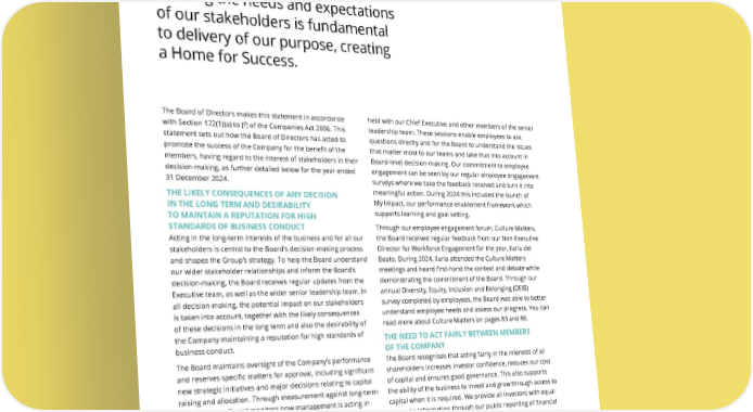 THE UNITE GROUP PLC Annual Report and Accounts 2024 90 GOVERNANCE GOVERNANCE The Board of Directors makes this statement in accordance with Section 172(1)(a) to (f) of the Companies Act 2006. This statement sets out how the Board of Directors has acted to promote the success of the Company for the benefit of the members, having regard to the interest of stakeholders in their decision-making, as further detailed below for the year ended 31 December 2024. THE LIKELY CONSEQUENCES OF ANY DECISION IN THE LONG TERM AND DESIRABILITY TO MAINTAIN A REPUTATION FOR HIGH STANDARDS OF BUSINESS CONDUCT Acting in the long-term interests of the business and for all our stakeholders is central to the Board’s decision-making process and shapes the Group’s strategy. To help the Board understand our wider stakeholder relationships and inform the Board’s decision-making, the Board receives regular updates from the Executive team, as well as the wider senior leadership team. In all decision-making, the potential impact on our stakeholders is taken into account, together with the likely consequences of these decisions in the long term and also the desirability of the Company maintaining a reputation for high standards of business conduct. The Board maintains oversight of the Company’s performance and reserves specific matters for approval, including significant new strategic initiatives and major decisions relating to capital raising and allocation. Through measurement against long-term objectives, the Board monitors how management is acting in accordance with the Board’s agreed strategy and the long-term interests of our key stakeholders. THE INTERESTS OF OUR EMPLOYEES As a service business providing homes for 68,000 young people, who are often living away from home for the first time, the Board recognises the importance of our people and the role they play in delivering our Home for Success purpose. The Board receives regular feedback through Unite Live sessions held with our Chief Executive and other members of the senior leadership team. These sessions enable employees to ask questions directly and for the Board to understand the issues that matter most to our teams and take that into account in Board-level decision-making. Our commitment to employee engagement can be seen by our regular employee engagement surveys where we take the feedback received and turn it into meaningful action. During 2024 this included the launch of My Impact, our performance enablement framework which supports learning and goal setting. Through our employee engagement forum, Culture Matters, the Board received regular feedback from our Non-Executive Director for Workforce Engagement for the year, Ilaria del Beato. During 2024, Ilaria attended the Culture Matters meetings and heard first-hand the context and debate while demonstrating the commitment of the Board. Through our annual Diversity, Equity, Inclusion and Belonging (DEIB) survey completed by employees, the Board was able to better understand employee needs and assess our progress. You can read more about Culture Matters on pages 83 and 86. THE NEED TO ACT FAIRLY BETWEEN MEMBERS OF THE COMPANY The Board recognises that acting fairly in the interests of all shareholders increases investor confidence, reduces our cost of capital and ensures good governance. This also supports the ability of the business to invest and grow through access to capital when it is required. We provide all investors with equal access to information through our public reporting of financial results and trading statements, as well as additional disclosures in areas such as sustainability through our corporate website. Our Annual General Meeting also provides an opportunity for all shareholders to have their say. We engage regularly with investors throughout the year and the Chair of the Board engages with shareholders on governance matters. OUR SECTION 172 STATEMENT Meeting the needs and expectations of our stakeholders is fundamental to delivery of our purpose, creating a Home for Success.