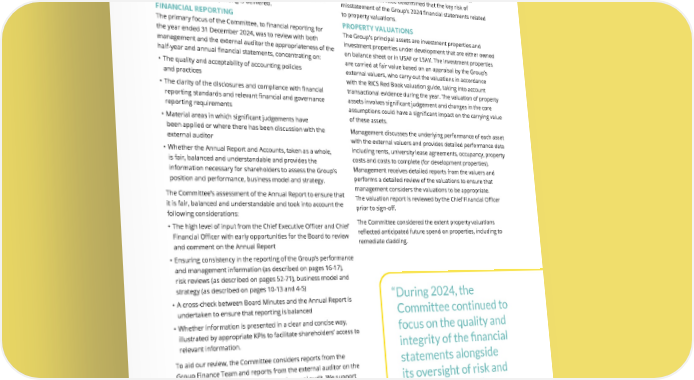 THE UNITE GROUP PLC Annual Report and Accounts 2024 103 have been taken into consideration when preparing this Annual Report. The Committee notes the FRC’s review does not provide assurance that the Annual Report is correct in all material respects as the FRC’s role is not to verify the information provided, but to consider compliance with reporting requirements. SIGNIFICANT ISSUES CONSIDERED After discussion with both management and the external auditor, the Committee determined that the key risk of misstatement of the Group’s 2024 financial statements related to property valuations. PROPERTY VALUATIONS The Group’s principal assets are investment properties and investment properties under development that are either owned on balance sheet or in USAF or LSAV. The investment properties are carried at fair value based on an appraisal by the Group’s external valuers, who carry out the valuations in accordance with the RICS Red Book valuation guide, taking into account transactional evidence during the year. The valuation of property assets involves significant judgement and changes in the core assumptions could have a significant impact on the carrying value of these assets. Management discusses the underlying performance of each asset with the external valuers and provides detailed performance data including rents, university lease agreements, occupancy, property costs and costs to complete (for development properties). Management receives detailed reports from the valuers and performs a detailed review of the valuations to ensure that management considers the valuations to be appropriate. The valuation report is reviewed by the Chief Financial Officer prior to sign-off. The Committee considered the extent property valuations reflected anticipated future spend on properties, including to remediate cladding. Updates to the UK Corporate Governance Code, in particular the recent changes to provision 29, were monitored, including consideration of the impact beyond January 2026. While the provision applies to financial years beginning on or after 1 January 2026, the Audit & Risk Committee has considered the impact of this. The Audit & Risk Committee has considered the frameworks that form our material controls and how we are assured they are operating effectively. The Audit & Risk Committee will continue to review the potential impact on the Group with management to ensure that suitable reporting is delivered. FINANCIAL REPORTING The primary focus of the Committee, to financial reporting for the year ended 31 December 2024, was to review with both management and the external auditor the appropriateness of the half-year and annual financial statements, concentrating on: • The quality and acceptability of accounting policies and practices • The clarity of the disclosures and compliance with financial reporting standards and relevant financial and governance reporting requirements • Material areas in which significant judgements have been applied or where there has been discussion with the external auditor • Whether the Annual Report and Accounts, taken as a whole, is fair, balanced and understandable and provides the information necessary for shareholders to assess the Group’s position and performance, business model and strategy. The Committee’s assessment of the Annual Report to ensure that it is fair, balanced and understandable and took into account the following considerations: • The high level of input from the Chief Executive Officer and Chief Financial Officer with early opportunities for the Board to review and comment on the Annual Report • Ensuring consistency in the reporting of the Group’s performance and management information (as described on pages 16-17), risk reviews (as described on pages 52-71), business model and strategy (as described on pages 10-13 and 4-5) • A cross-check between Board Minutes and the Annual Report is undertaken to ensure that reporting is balanced • Whether information is presented in a clear and concise way, illustrated by appropriate KPIs to facilitate shareholders’ access to relevant information. To aid our review, the Committee considers reports from the Group Finance Team and reports from the external auditor on the outcomes of their half-year review and annual audit. We support Deloitte in displaying the professional scepticism its role requires. INTERACTIONS WITH THE FINANCIAL REPORTING COUNCIL (FRC) In December, the FRC’s Corporate Reporting Review (CRR) team notified us that the Group’s FY2023 Annual Report and Accounts had been selected for review and confirmed there were no queries to raise following this review. There were some matters which the FRC believed could be improved for the benefit of users, and these “ During 2024, the Committee continued to focus on the quality and integrity of the financial statements alongside its oversight of risk and internal controls.” ROSS PATERSON CHAIR OF THE AUDIT & RISK COMMITTEE