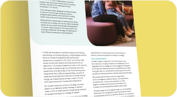 THE UNITE GROUP PLC Annual Report and Accounts 2024 69 In 2024, we evaluated our portfolio’s exposure to flooding, overheating, and heating reduction using Intergovernmental Panel on Climate Change (IPCC) RCP scenarios for temperature increases of 1.5°C, 2.0°C, and +4°C by 2100, chosen as the most relevant and likely scenarios to our operations. The analysis showed that under a +4°C scenario, the number of assets at high risk of flooding more than tripled (from 23 to 82), those at risk of overheating nearly tripled (from 44 to 128) and approximately a quarter of assets would see significant reductions in winter heating energy use. Impacts would be lower under 1.5°C and 2.0°C scenarios but still increase with temperature. Our analysis reassures us that our strategy, including actions in our Net Zero Carbon Pathway, is resilient under a 2.0°C or lower scenario, though we will continue to reassess and adjust our strategy as needed. Under a +4°C scenario, we will need to adjust our strategy and financial planning to address worsening flooding and overheating. This may involve divesting less resilient assets, increasing investment in resilience, and modifying operations. We may also see changes in customer behaviour and supply chain disruptions. Enhanced due diligence in supply chain selection, especially for materials from climate-impacted areas, will be crucial. Our transition risk analysis considers rising commodity costs due to climate policy, influencing our sustainable procurement approach. A more detailed overheating risk analysis is planned for 2025 to refine strategic adjustments for all warming scenarios. Overheating risk persists, but we anticipate time to adapt our strategy. RISK MANAGEMENT Climate change is a significant risk influencing our long- term decisions, including investment and divestment, and is integrated into our strategy and risk management framework. Our three main objectives are to be a Great Place to Live, Work and Invest, with our commitment to achieving net zero carbon by 2030 and reducing resource intensity supporting these goals. We collaborate with teams across the organisation, senior management, external advisers, and stakeholders to identify risks. These are documented in our Risk Register, reviewed by the Executive Committee, and principal risks are assessed by the Board twice a year. Climate change risk is managed through our risk framework, where each risk is assigned an owner, evaluated for impact, and associated controls are identified. Residual risk is assessed against our risk appetite. As part of our overall risk management process, we conducted a climate-related risk scoping workshop assessment and identified the most material risks, evaluating the methodology for assessing future climate scenarios. Each risk is assigned considering their likelihood, business consequences, possible management and mitigation strategies, Scenario modelling, including climate scenario analysis in this CFD and TCFD disclosure, helps us understand risks under different stress levels and test mitigation plans. We conducted a climate-related risk assessment workshop to identify key risks 00 Case study New Bromley Place development We welcomed students in October to our newest development, Bromley Place, which provides 271 students with a home in Nottingham city centre. Located next to the city’s Victoria Centre shopping complex, the £36 million development was completed in 12 months. The building has been designed to meet the needs of second- and third-year students as well as postgraduate students, with amenities including larger study areas and a state-of-the-art gym. Bromley Place incorporates an existing three-storey building into its design and has the lowest embodied carbon of any current Unite Students development. To further reduce impact on the environment, the building is fitted with low-energy LED lighting and high efficiency heating and cooling systems.